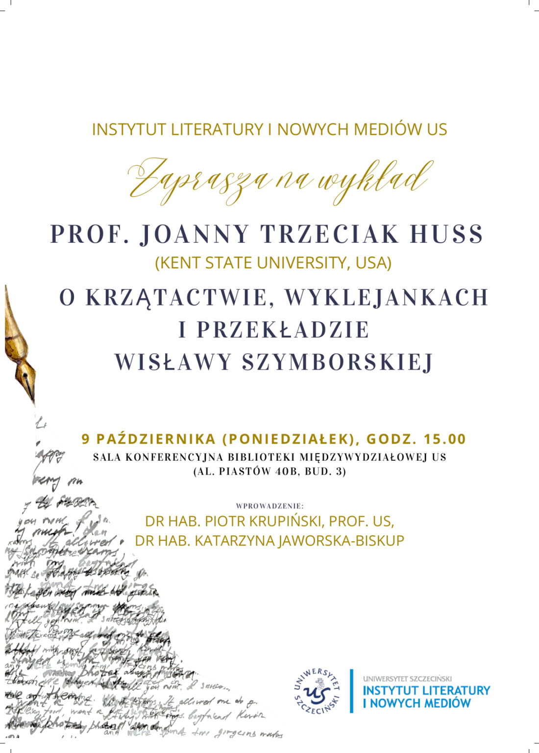 Zapraszamy na wykład prof. Joanny Trzeciak-Huss (Kent State University, USA). Wykład będzie dotyczył tłumaczenia poezji Wisławy Szymborskiej.