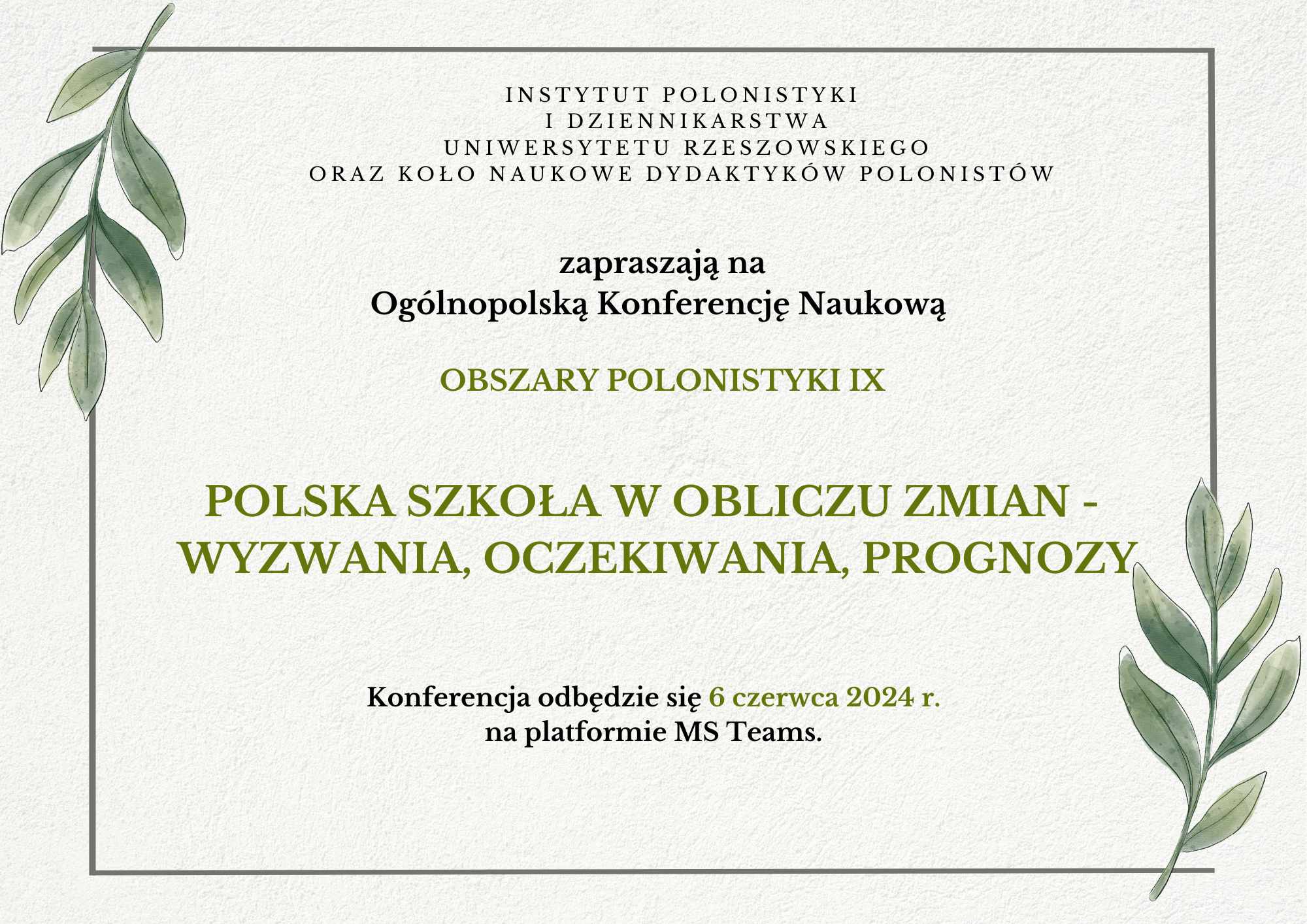 Instytut Polonistyki i Dziennikarstwa Uniwersytetu Rzeszowskiego oraz Koło Naukowe Dydaktyków Polonistów zapraszają na Ogólnopolską Konferencję Naukową Obszary Polonistyki IX: Polska szkoła w obliczu zmian – wyzwania, oczekiwania, prognozy.