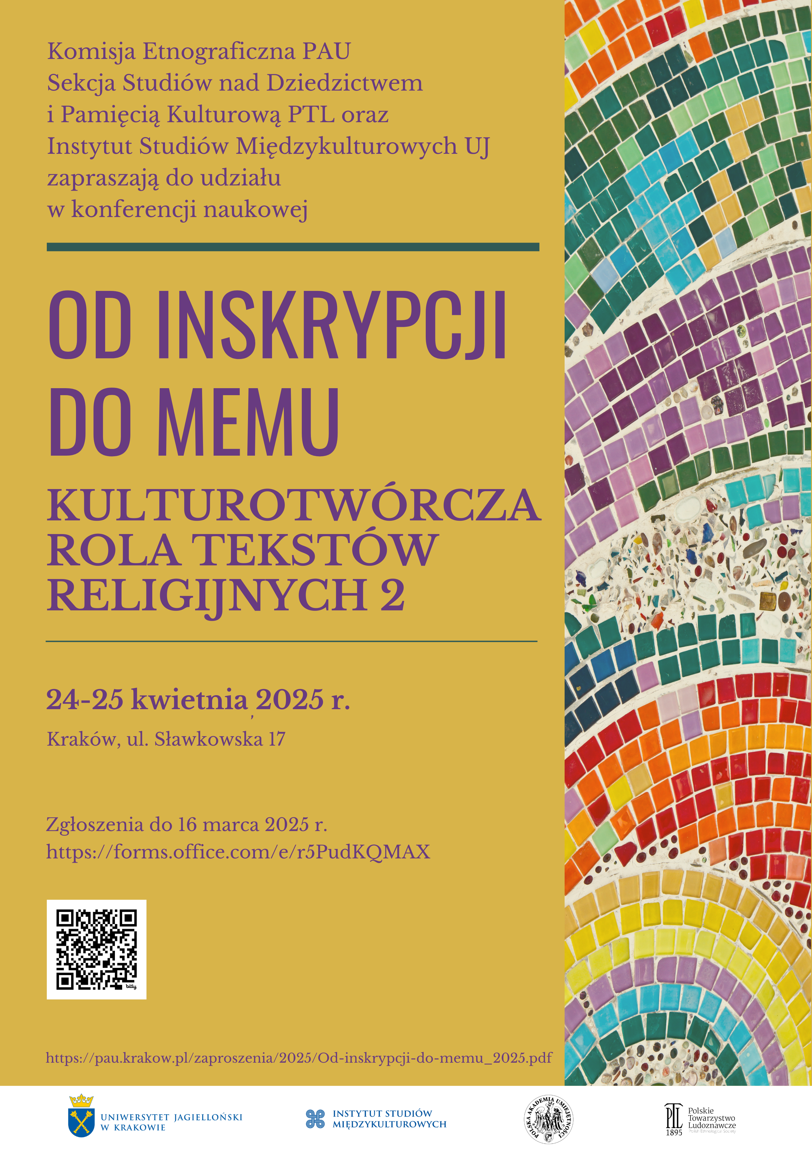 Komisja Etnograficzna Polskiej Akademii Umiejętności Sekcja Studiów nad Dziedzictwem i Pamięcią Kulturową Polskiego Towarzystwa Ludoznawczego oraz Instytut Studiów Międzykulturowych Uniwersytetu Jagiellońskiego zapraszają do udziału w ogólnopolskiej konferencji naukowej: OD INSKRYPCJI DO MEMU: KULTUROTWÓRCZA ROLA TEKSTÓW RELIGIJNYCH 2.