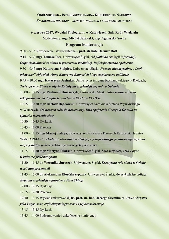 6 czerwca 2017 na Wydziale Filologicznym Uniwerstytetu Śląskiego w Katowicach odędzie się konferencja naukowa, którą organizuje Międzywydziałowe Doktoranckie Koło Naukowe Humanistów UŚ. Celem wydarzenia jest interdyscyplinarna wymiana poglądów i doświadczeń dotyczących istoty oraz znaczenia logosu – słowa. W ramach konferencji pragniemy przyjrzeć się istocie oralności i pokazać różne jej oblicza w kulturze.