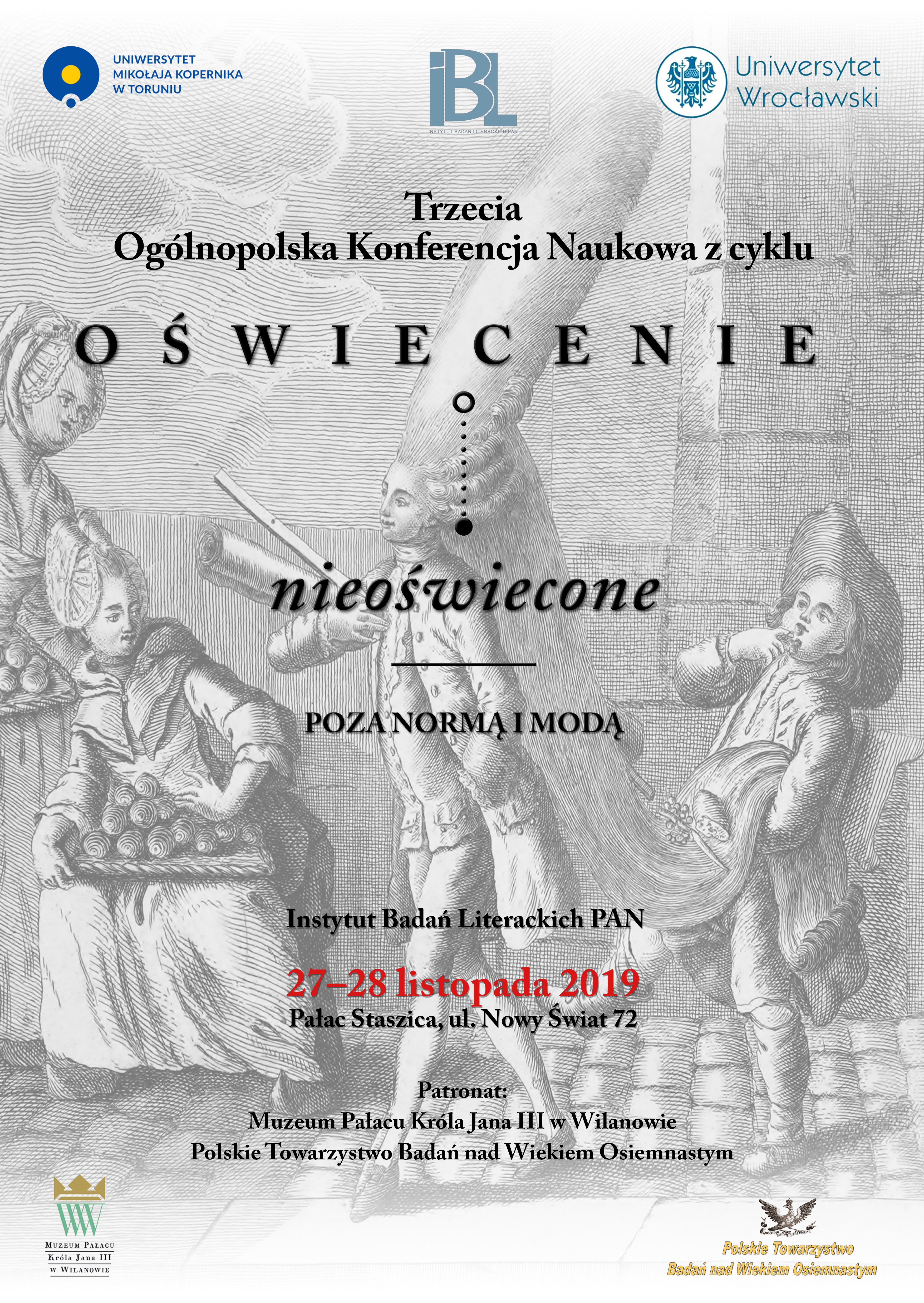 Serdecznie zapraszamy na konferencję, którą Pracownia Literatury Oświecenia organizuje we współpracy z Uniwersytetem Wrocławskim i Uniwersytetem Mikołaja Kopernika w Toruniu, pod patronatem Muzeum Pałacu Króla Jana III w Wilanowie oraz Polskiego Towarzystwa Badań nad Wiekiem Osiemnastym.