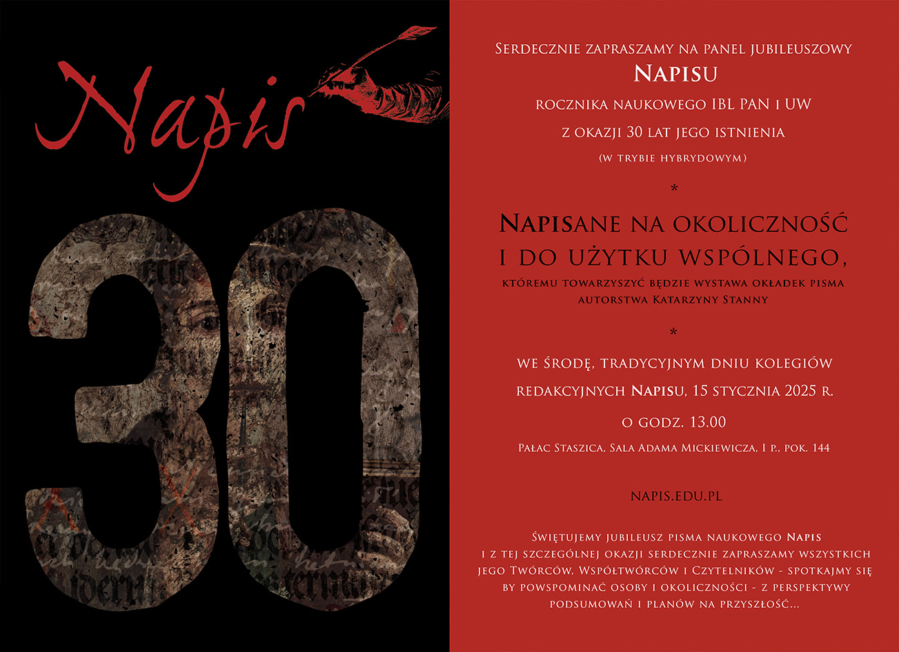 Serdecznie zapraszamy na panel jubileuszowy „Napisu”, rocznika naukowego IBL PAN i UW, z okazji 30 lat jego istnienia (w trybie hybrydowym) „NAPISane na okoliczność i do użytku wspólnego”, któremu towarzyszyć będzie wystawa okładek autorstwa Katarzyny Stanny.