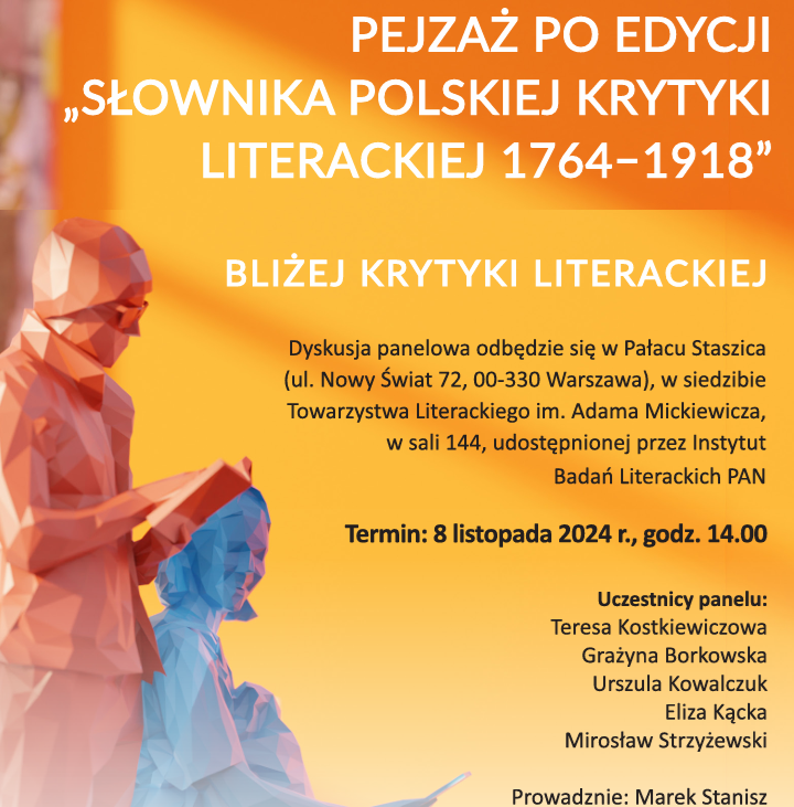 Towarzystwo Literackie im. Adama Mickiewicza oraz Instytut Polonistyki i Dziennikarstwa Uniwersytetu Rzeszowskiego mają zaszczyt zaprosić na dyskusję panelową pt. Pejzaż po edycji „Słownika polskiej krytyki literackiej 1764–1918” połączoną ze spotkaniem Autorek i Autorów haseł.