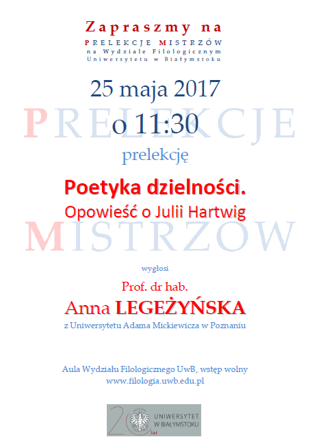 Pierwszą prelekcję, nt.: "Poetyka dzielności. O poezji Julii Hartwig", wygłosi profesor Anna Legeżyńska, wybitna znawczyni literatury i kultury współczesnej. Wykład rozpocznie się o godz. 11.30, 25 maja 2017 r. (czwartek) w auli Wydziału Filologicznego.