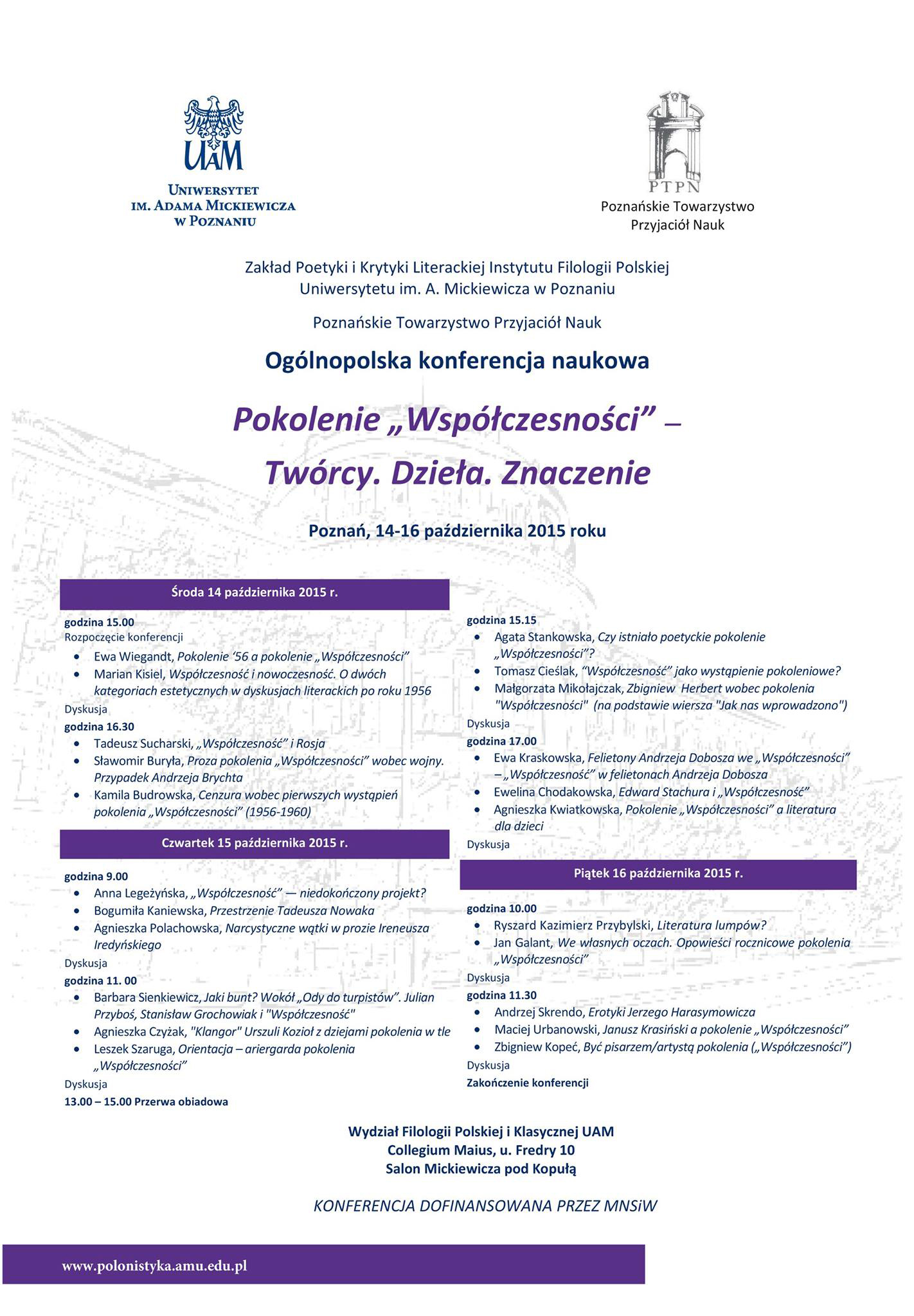 W dniach 13–16 października 2015 r. w Collegium Maius (ul. Fredry 10, Salon Mickiewicza pod Kopułą) odbędzie się ogólnopolska konferencja naukowa Pokolenie „Współczesności” – Twórcy. Dzieła. Znaczenie. Organizatorami konferencji są Zakład Poetyki i Krytyki Literackiej IFP UAM oraz Poznańskie Towarzystwo Przyjaciół Nauk. Program konferencji w załączniku.