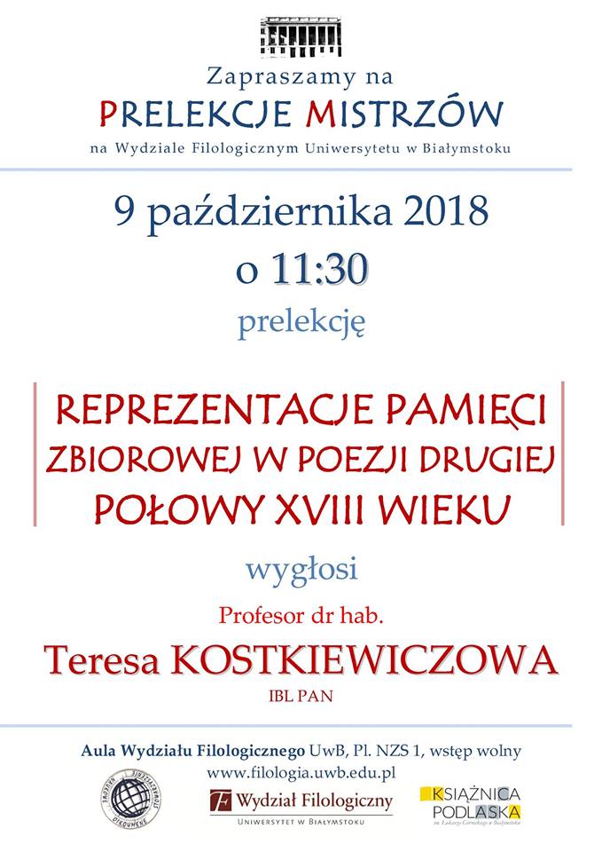 Kolejną mistrzowską prelekcję wygłosi wybitna badaczka literatury polskiej Profesor Teresa Kostkiewiczowa.