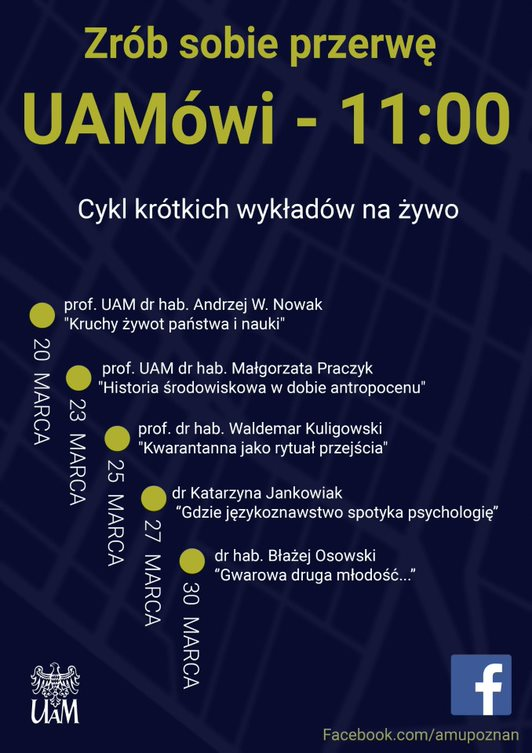 "Zrób sobie przerwę! UAMówi - 11.00", to hasło cyklu krótkich (trzydziestominutowych) wykładów na żywo, który 20 marca ruszył na profilu UAM na Facebooku. Ich tematyka jest różnorodna. Nagrania wykładów z napisami zamieszczane są na oficjalnym kanale Youtube UAM 24 godziny po transmisji na żywo.