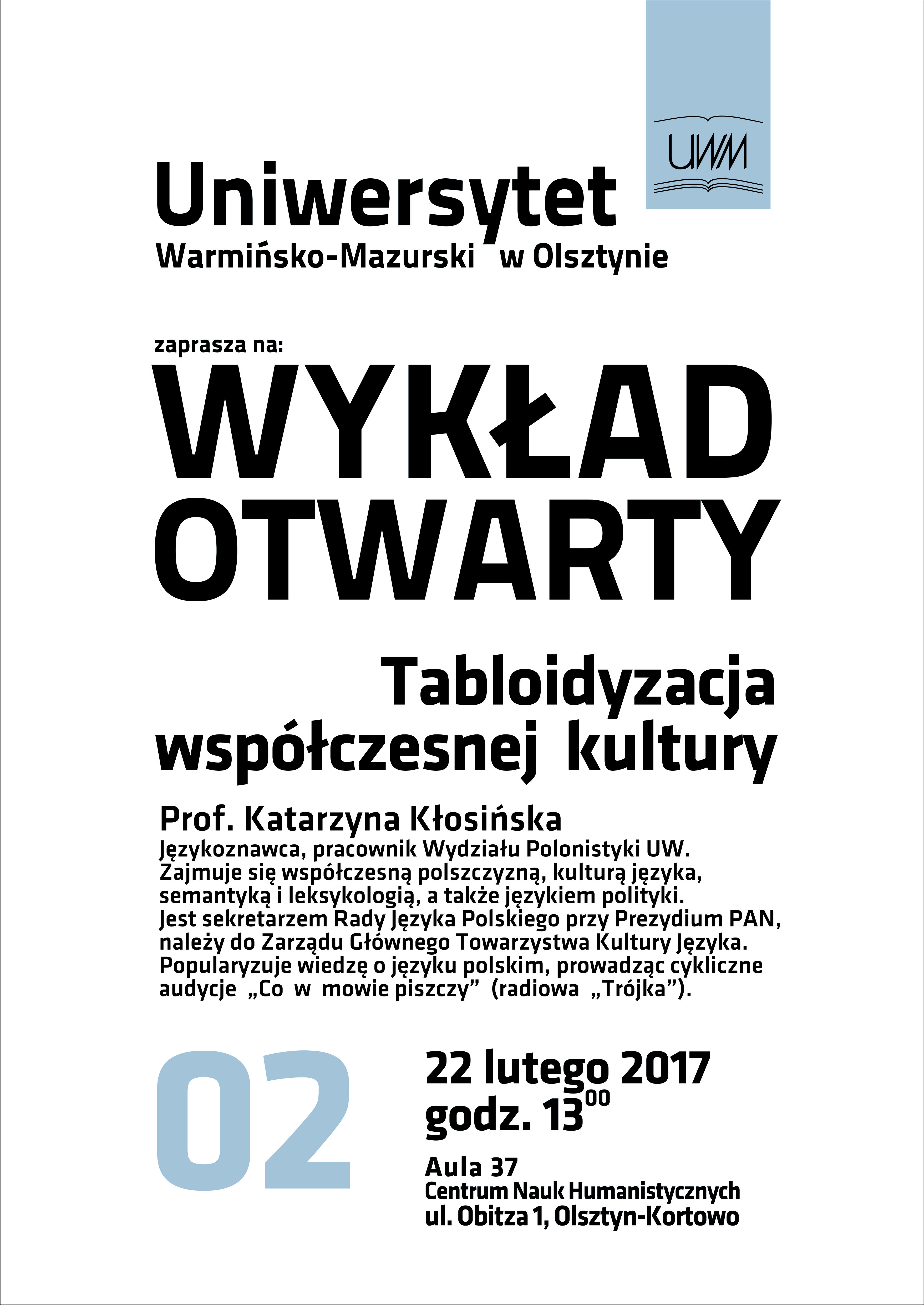 Wykład odbędzie 22 lutego 2017 roku (początek godz. 13.00) w Centrum Nauk Humanistycznych (ul. K. Obitza 1, Olsztyn - Kortowo), aula 37.
