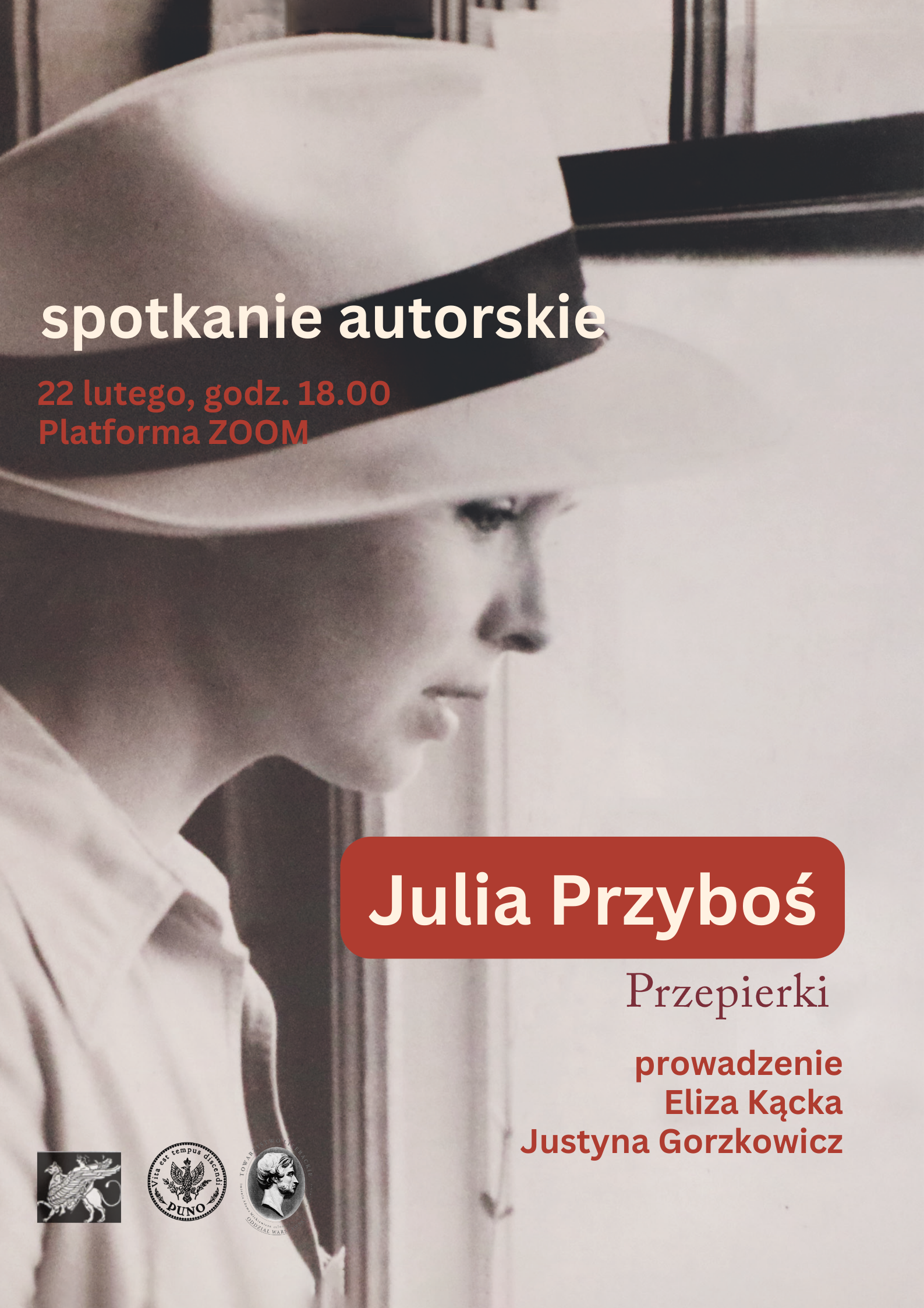 Spotkanie poprowadzą Eliza Kącka i Justyna Gorzkowicz, które wprowadzą nas w świat twórczości autorki. Julia Przyboś, córka poety Juliana Przybosia, urodziła się w Krakowie, wczesne dzieciństwo spędziła w Szwajcarii, a po studiach na Wydziale Filologii Romańskiej w Warszawie i zdobyciu tytułu Ph.D. na Yale University wykładała literaturę francuską i porównawczą w Nowym Jorku. Jej prace ukazały się w renomowanej kolekcji Essais francuskiego wydawnictwa José Corti, gdzie można znaleźć takie tytuły jak „L’Entreprise mélodramatique”, „Zoom sur les décadents" oraz „Les Aventures du corps masculin".