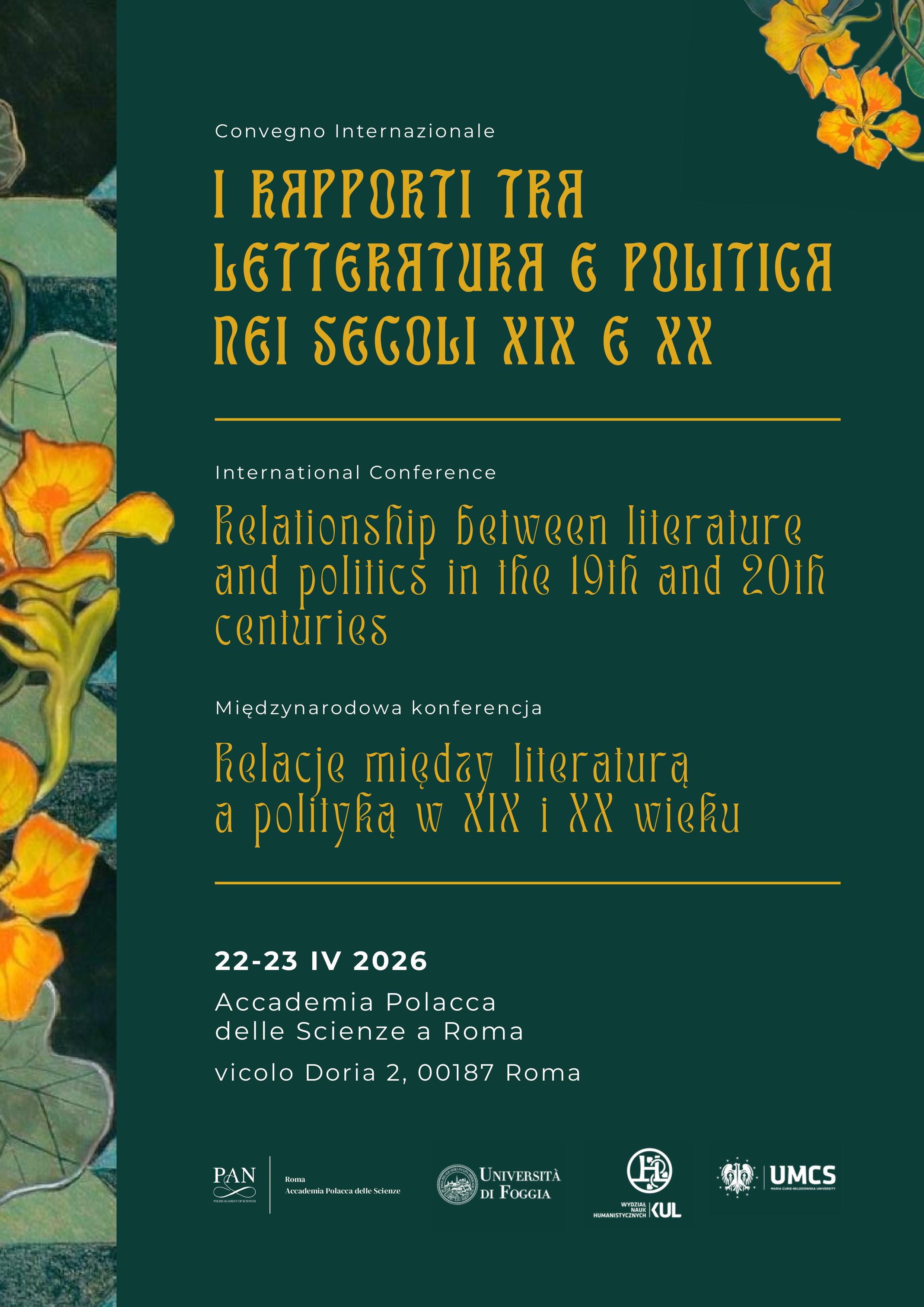 W dniach 22-23 kwietnia 2026 roku w Rzymie odbędzie się interdyscyplinarna, międzynarodowa konferencja naukowa „Relacje między literaturą a polityką w XIX i XX wieku”. Konferencja organizowana jest przez Uniwersytet w Foggi, Katolicki Uniwersytet Lubelski Jana Pawła II, Uniwersytet Marii Curie-Skłodowskiej w Lublinie i Stację Naukową PAN w Rzymie.