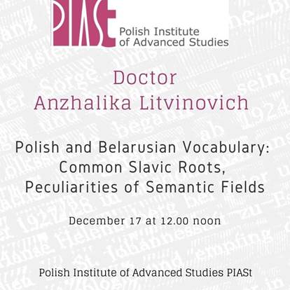 Ostatni w tym roku kalendarzowym wykład w Polskim Instytucie Studiów Zaawansowanych PIASt wygłosi dr Anzhalika Litvinovich z Grodzieńskiego Uniwersytetu Państwowego im. Janki Kupały (https://piast.pan.pl/index.php?option=com_content&view=article&id=633:anzhalika-litvinovich&catid=77&Itemid=306&lang=en).