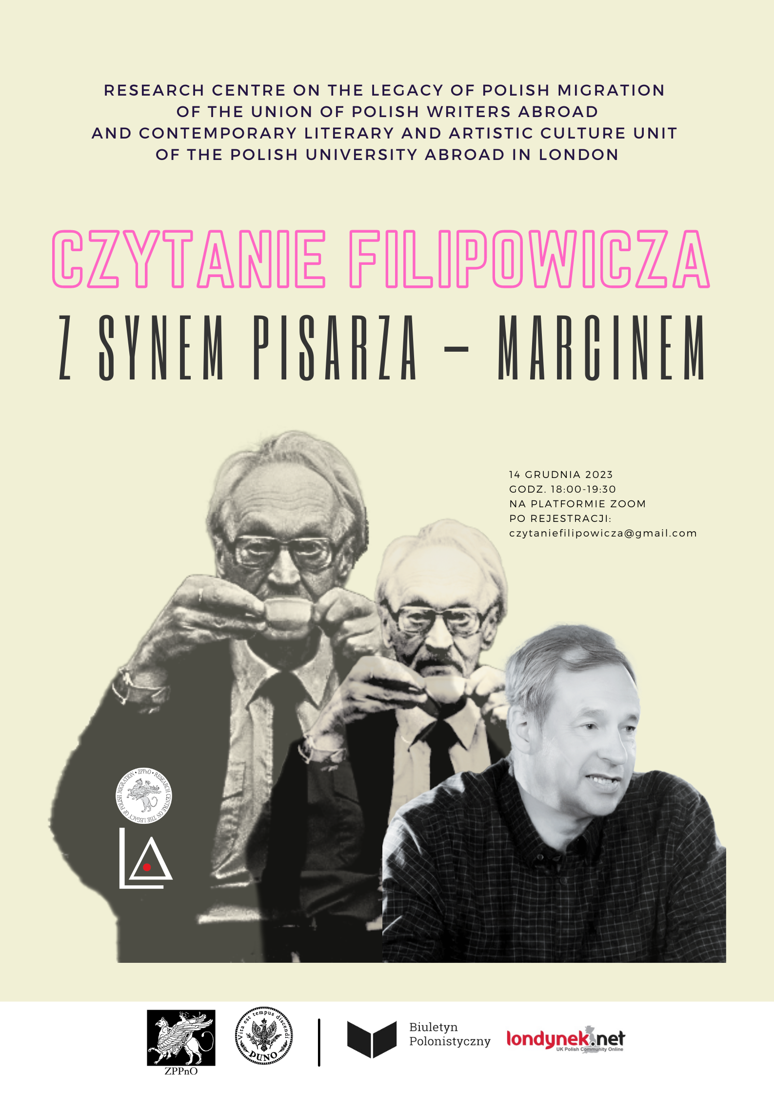 14 grudnia br o godz. 18 czasu londyńskiego zapraszamy na kolejne wydarzenie literackie z cyklu „Czytanie Filipowicza”, podczas którego będziemy mieli okazję rozmawiać o twórczości pisarza z jego synem, Marcinem.