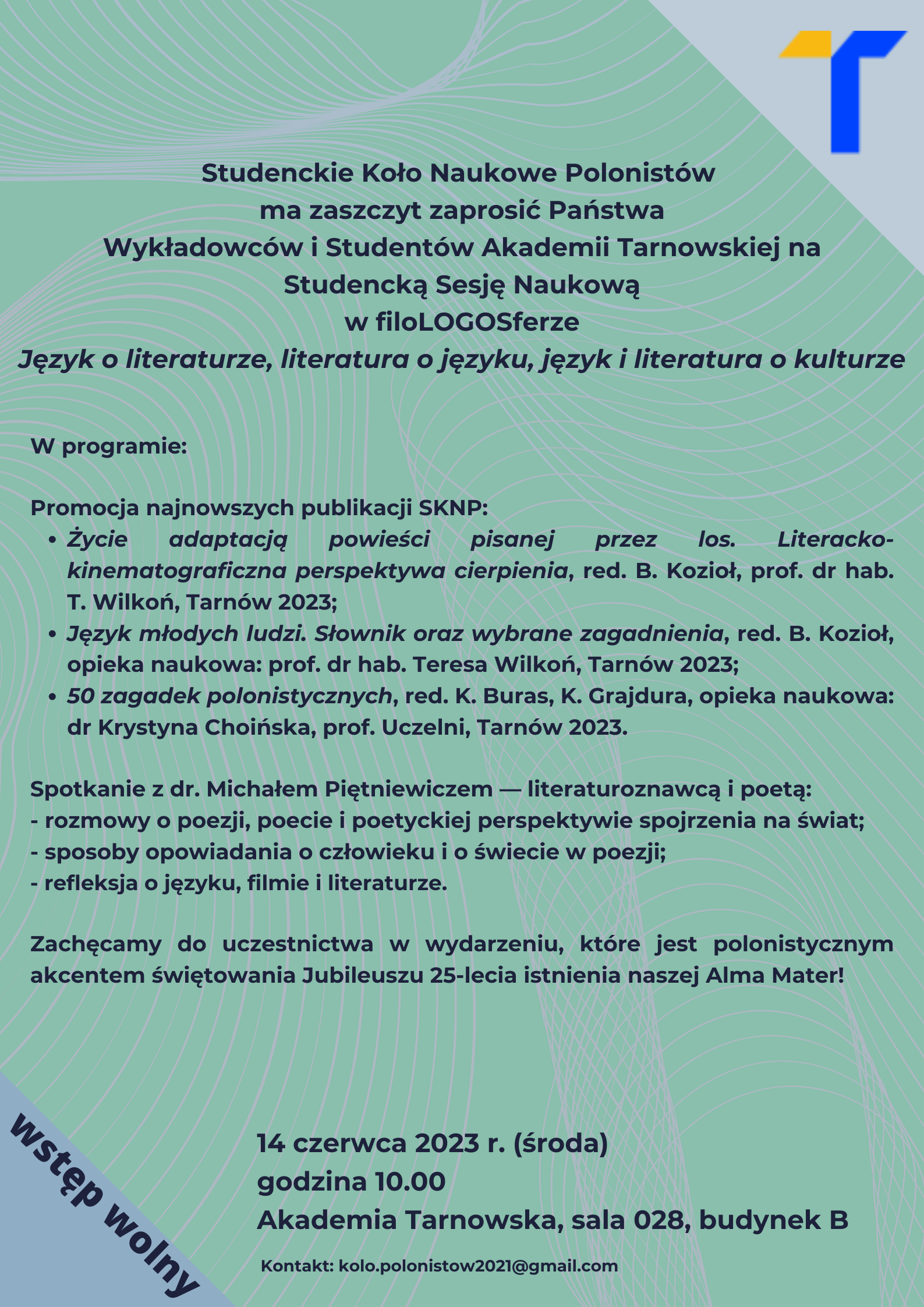Katedra Filologii Polskiej zaprasza na ogólnopolską konferencję naukową O języku, przez język, w języku, która odbędzie się w dniu 15 czerwca 2023 r. w sali A 120 w budynku głównym Akademii Tarnowskiej.