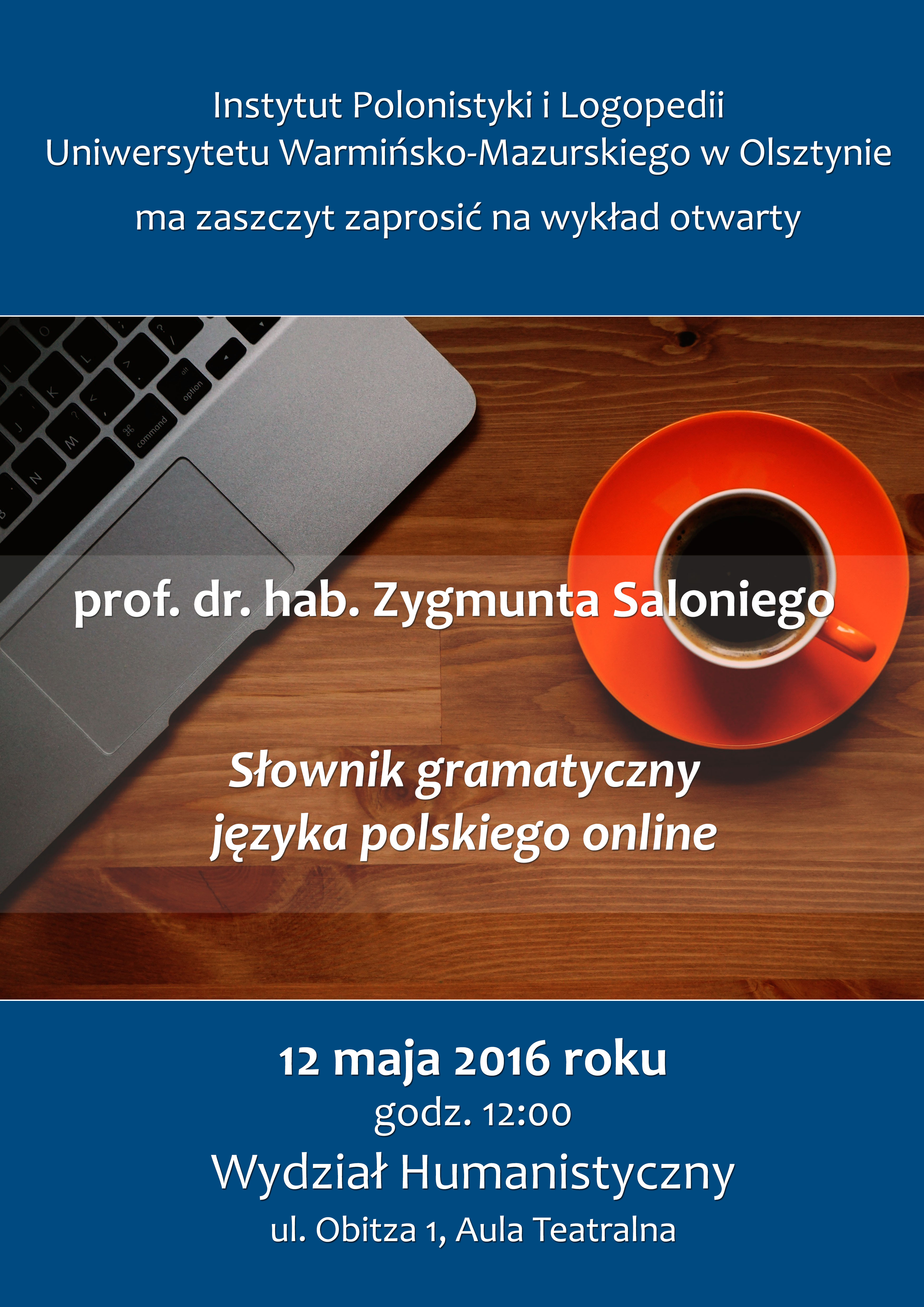 Wyższa Szkoła Filologiczna we Wrocławiu oraz Grupa Naukowa G4.19 (Katedra Inteligencji Obliczeniowej, Politechnika Wrocławska) zapraszają na wykład prof. dra hab. Zygmunta Saloniego pt „Słownik gramatyczny języka polskiego online”, który odbędzie się w dniu 9 maja 2016 (poniedziałek) na Politechnice Wrocławskiej w budynku C3, sala 22. Wykład rozpocznie się o godz. 13.15.