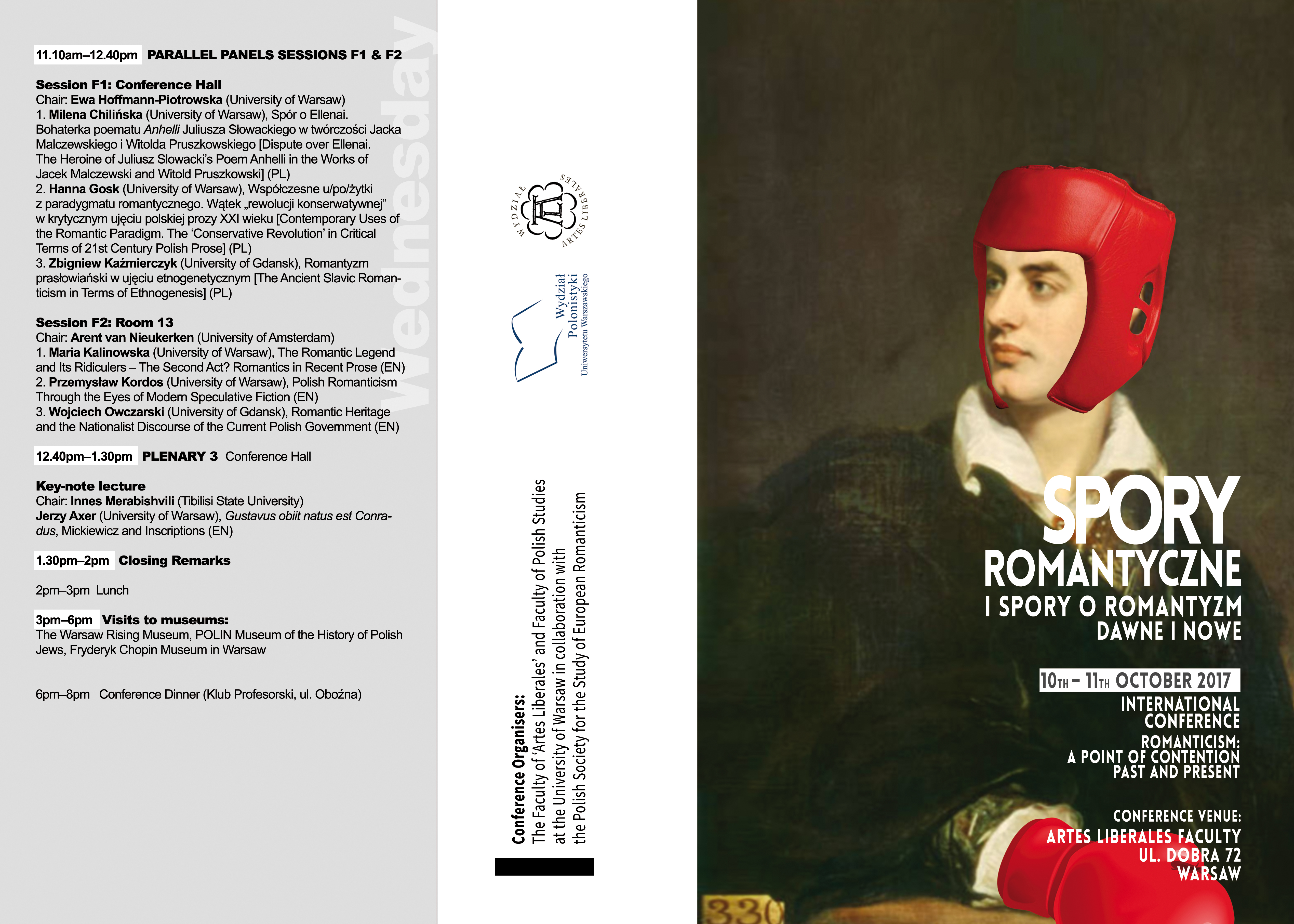 Wydział „Artes Liberales” i Wydział Polonistyki Uniwersytetu Warszawskiego przy współpracy z Polskim Towarzystwem Studiów nad Europejskim Romantyzmem zapraszają na międzynarodową konferencję naukową pt. „Spory romantyczne i spory o romantyzm (dawne i nowe)”. Konferencja odbędzie się w dniach 10–11 października 2017 roku w Warszawie (w siedzibie Wydziału „Artes Liberales” przy ul. Dobrej 72).