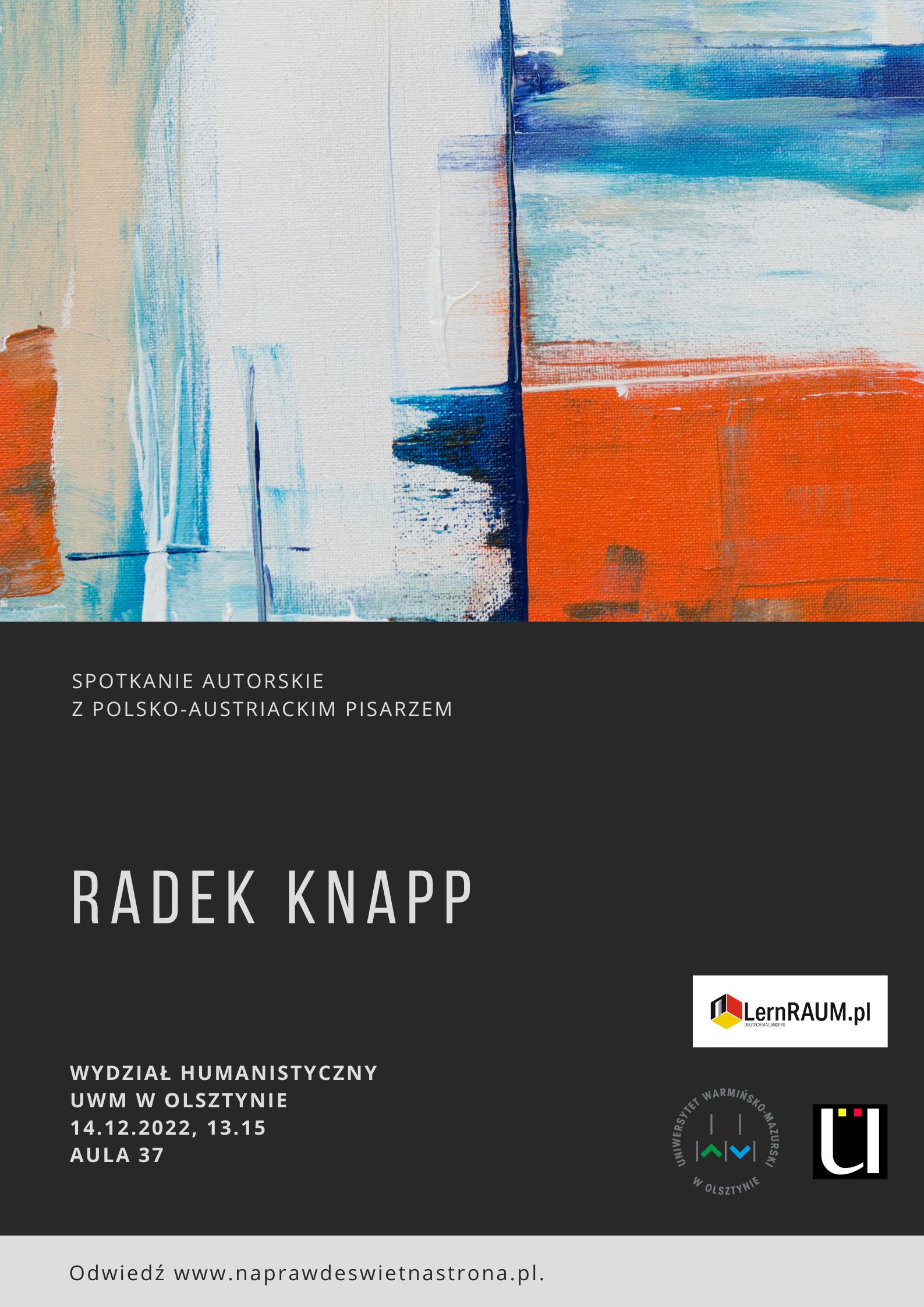 Zapraszamy na spotkanie autorskie z polsko-austriackim pisarzem Radkiem Knappem (spotkanie w języku polskim). Odbędzie się na Wydziale Humanistycznym Uniwersytetu Warmińsko-Mazurskiego w Olsztynie (14.12.2022, godz. 13.15, aula 37).