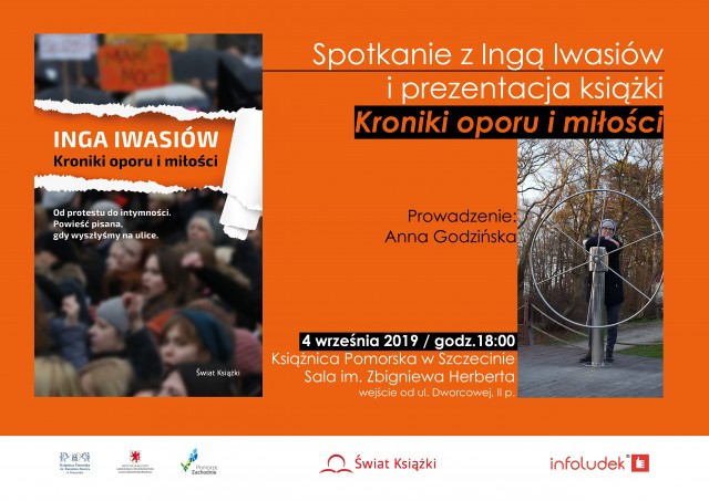Książnica Pomorska w Szczecinie zaprasza na spotkanie autorskie z Ingą Iwasiów, która zaprezentuje swoją najnowszą książkę „Kroniki oporu i miłości”. Spotkanie odbędzie się w Książnicy Pomorskiej, w Sali im. Zbigniewa Herberta o godz. 18.00. Prowadzenie: Anna Godzińska, współorganizator: "Świat Książki”.