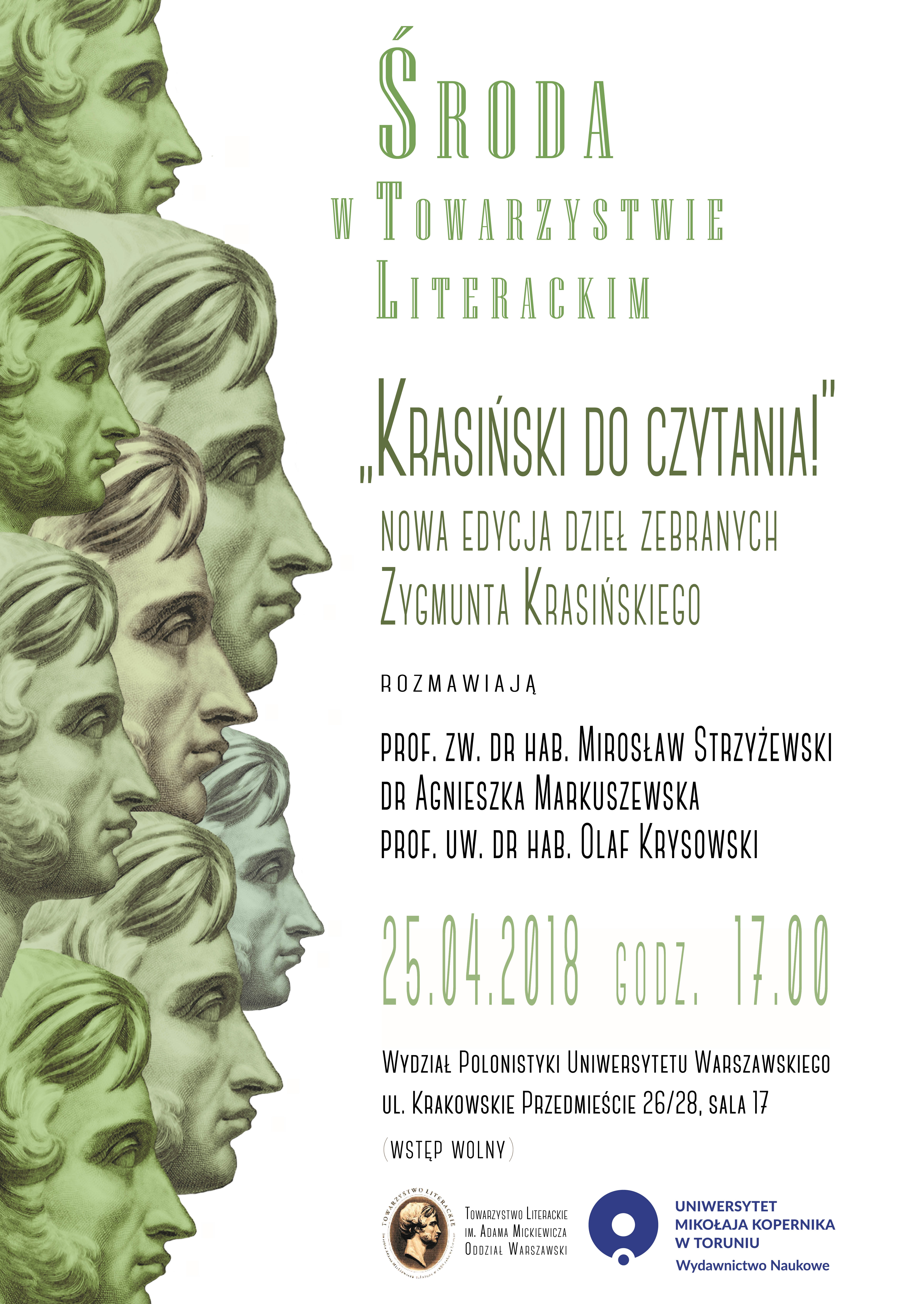 Zarząd Warszawskiego Oddziału Towarzystwa Literackiego im. Adama Mickiewicza zaprasza na kolejne spotkanie z cyklu „Środa w Towarzystwie Literackim”. Prof. Mirosław Strzyżewski oraz dr Agnieszka Markuszewska przedstawią nową edycję Dzieł zebranych Zygmunta Krasińskiego.