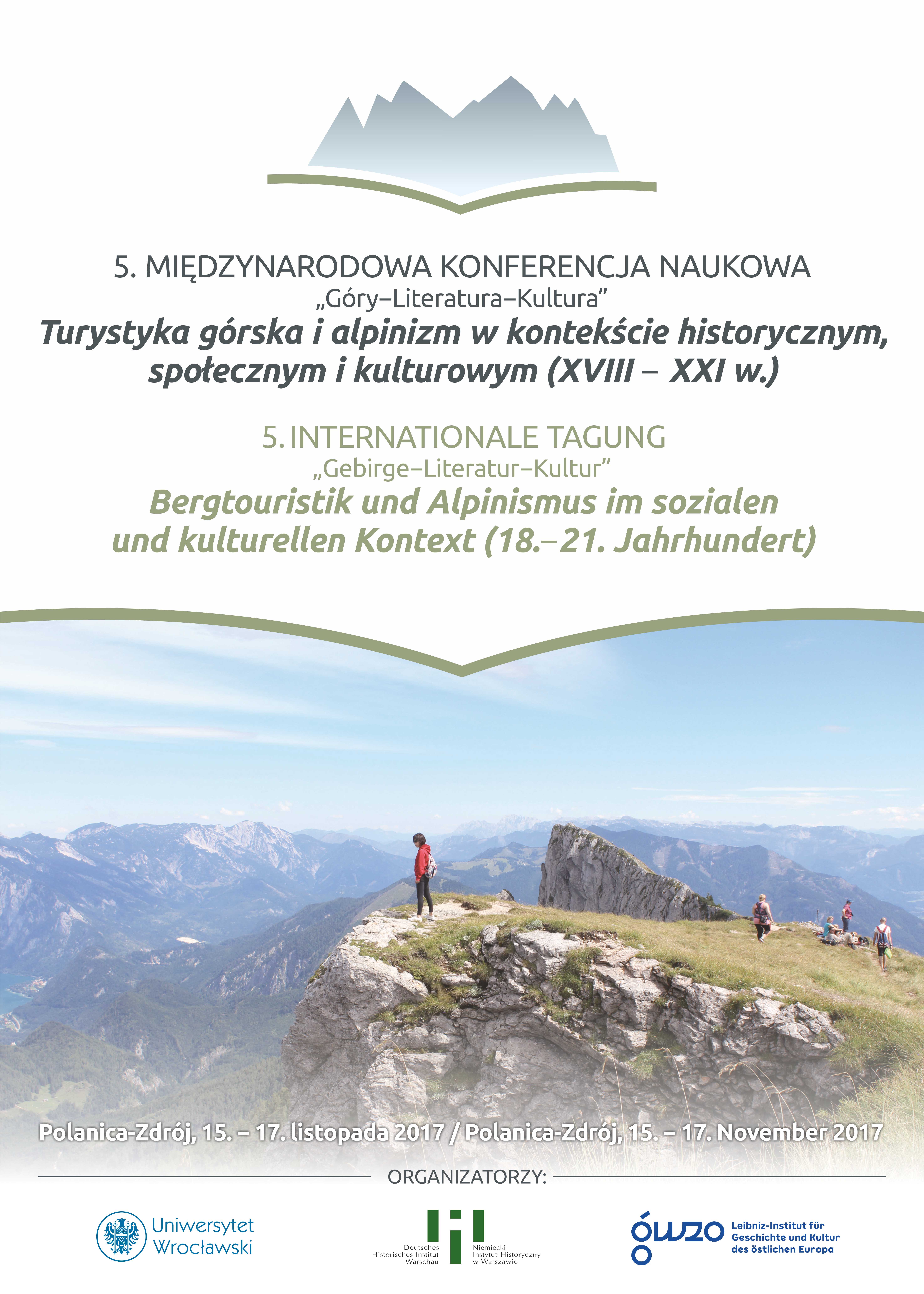 W imieniu Instytutu Filologii Polskiej Uniwersytetu Wrocławskiego, Redakcji rocznika „Góry-Literatura-Kultura”, Niemieckiego Instytutu Historycznego w Warszawie oraz Instytutu im. Leibniza Historii i Kultury Europy Wschodniej (GWZO) mamy zaszczyt zaprosić Państwa do wzięcia udziału w V edycji konferencji naukowej poświęconej problematyce górskiej. Jej tematem przewodnim pragniemy uczynić historię turystyki górskiej i alpinizmu.
