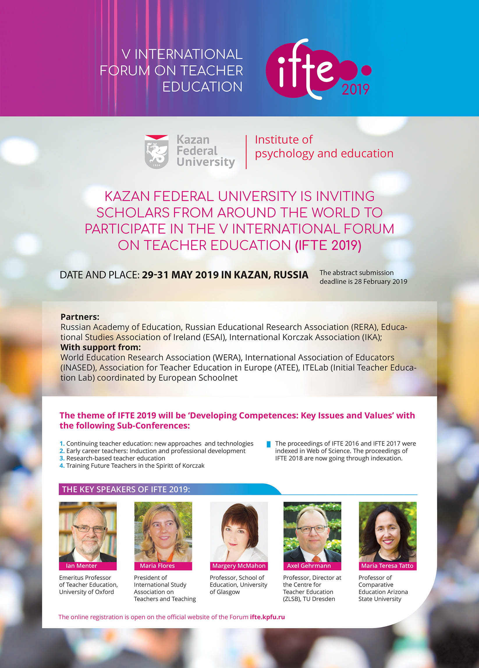 IFTE-2018 attracted more than 600 leading scholars in the field of teacher education (93 Russian and 65 overseas universities and educational organizations were represented by the forum participants). IFTE-2019 will gather leading scholars in the field of teacher education from all over the world (the UK, the US, Germany, Ireland, Slovenia, Canada, China and many others).