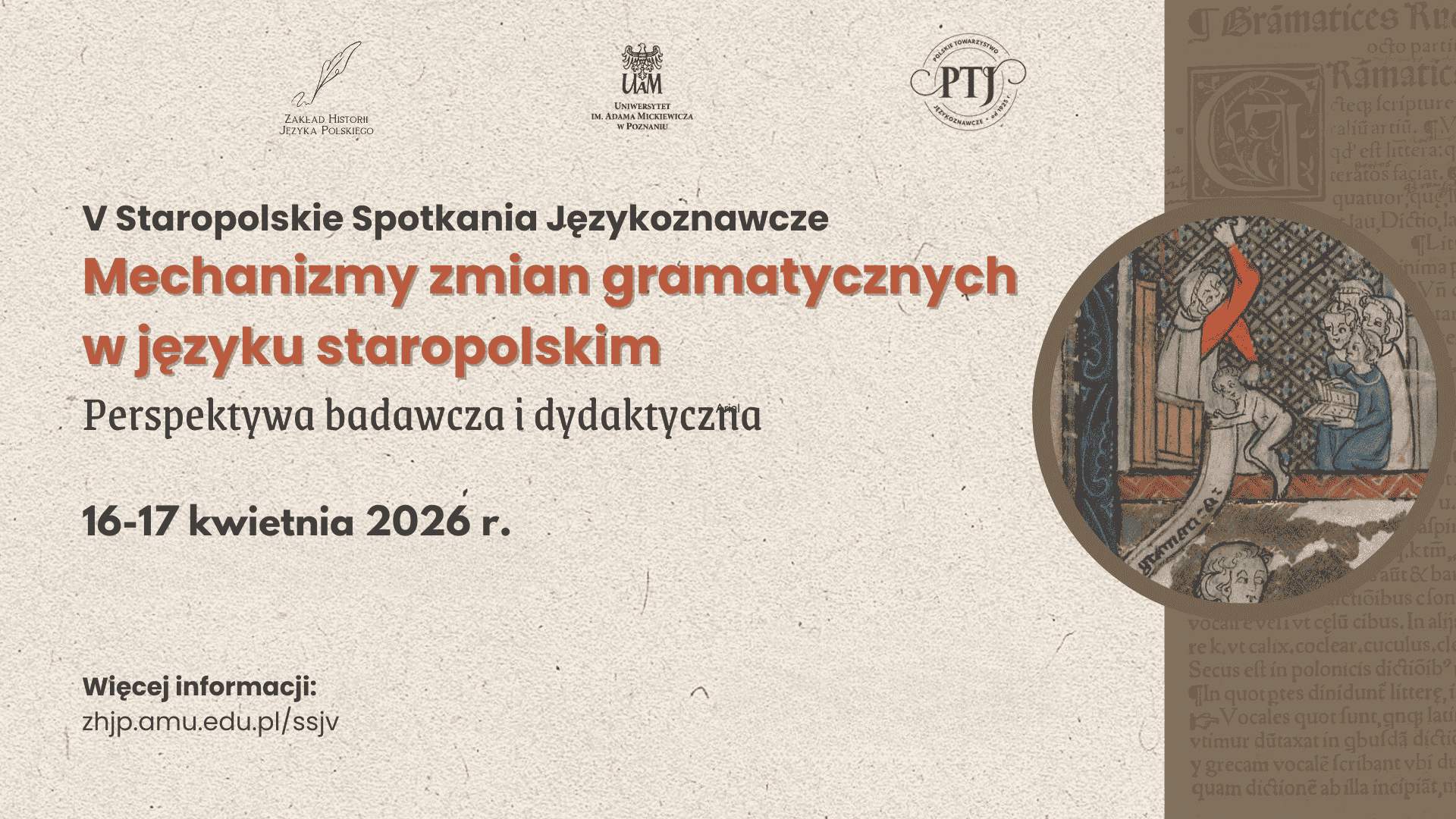 Zakład Historii Języka Polskiego oraz Wydział Filologii Polskiej i Klasycznej Uniwersytetu im. Adama Mickiewicza w Poznaniu serdecznie zapraszają do wzięcia udziału w V konferencji z cyklu Staropolskie Spotkania Językoznawcze, zatytułowanej Mechanizmy zmian gramatycznych w języku staropolskim. Perspektywa badawcza i dydaktyczna. Konferencja odbędzie się w dniach 16-17 kwietnia 2026 roku.
