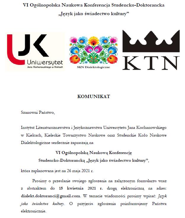Instytut Literaturoznawstwa i Językoznawstwa Uniwersytetu Jana Kochanowskiego w Kielcach, Kieleckie Towarzystwo Naukowe, Studenckie Koło Naukowe Dialektologiczne mają zaszczyt zaprosić na IX Ogólnopolską Naukową Konferencję Studencko--Doktorancką Język jako świadectwo kultury