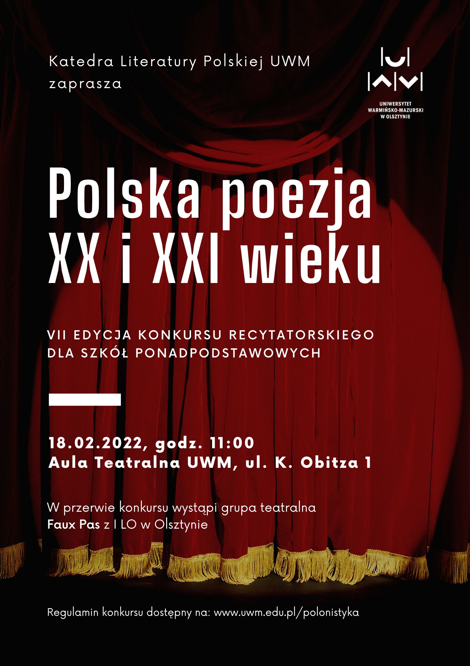 Zapraszamy do udziału w IX edycji konkursu recytatorskiego "Polska poezja XX i XXI wieku", organizowanego przez Katedrę Literatury Polskiej UWM w Olsztynie.