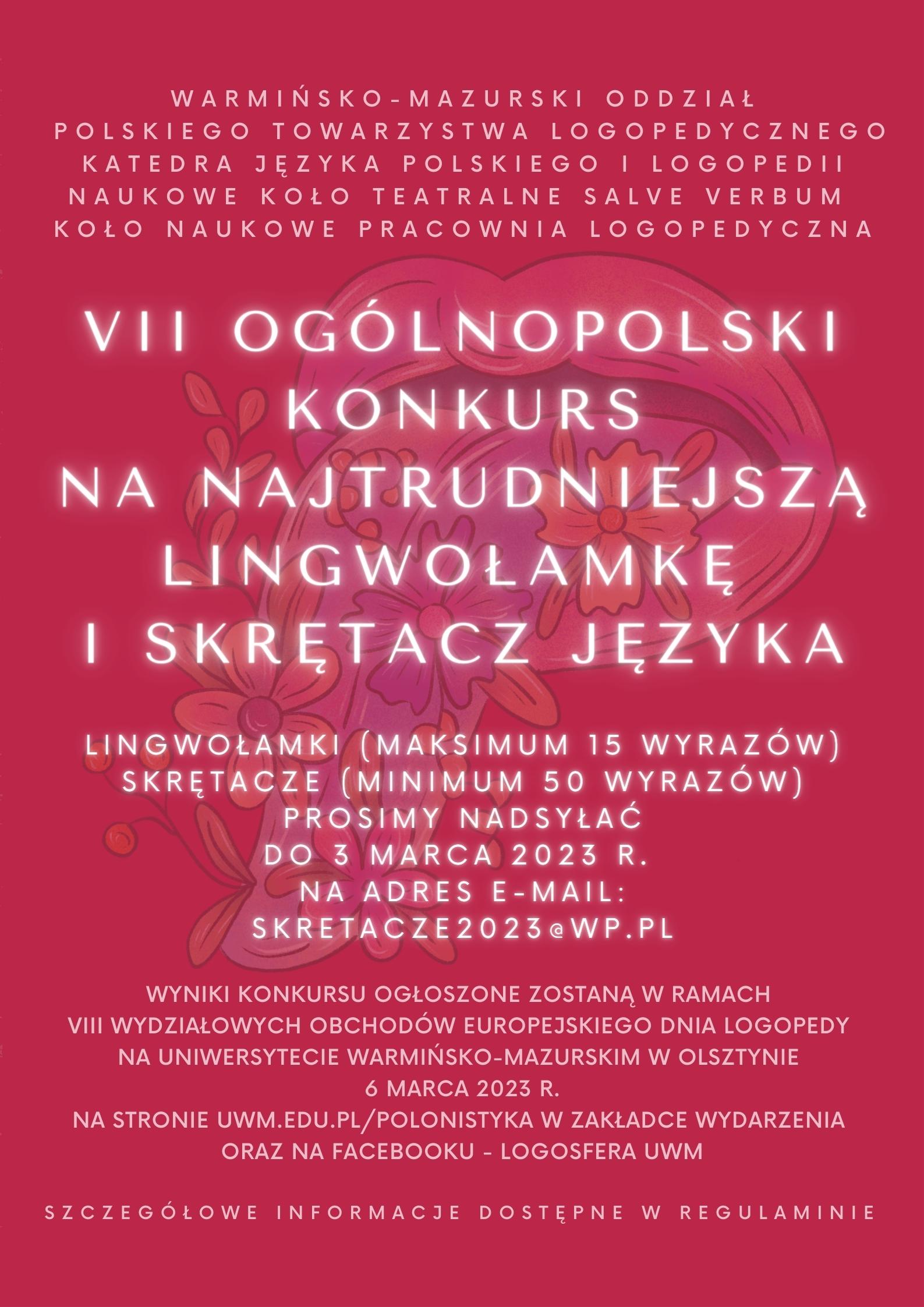 3. Wyniki konkursu zamieszczone zostaną 6 marca 2023 r. w dniu, w którym obchodzony jest Europejski Dzień Logopedy, na stronie www.uwm.edu.pl/polonistyka/ w zakładce Wydarzenia.