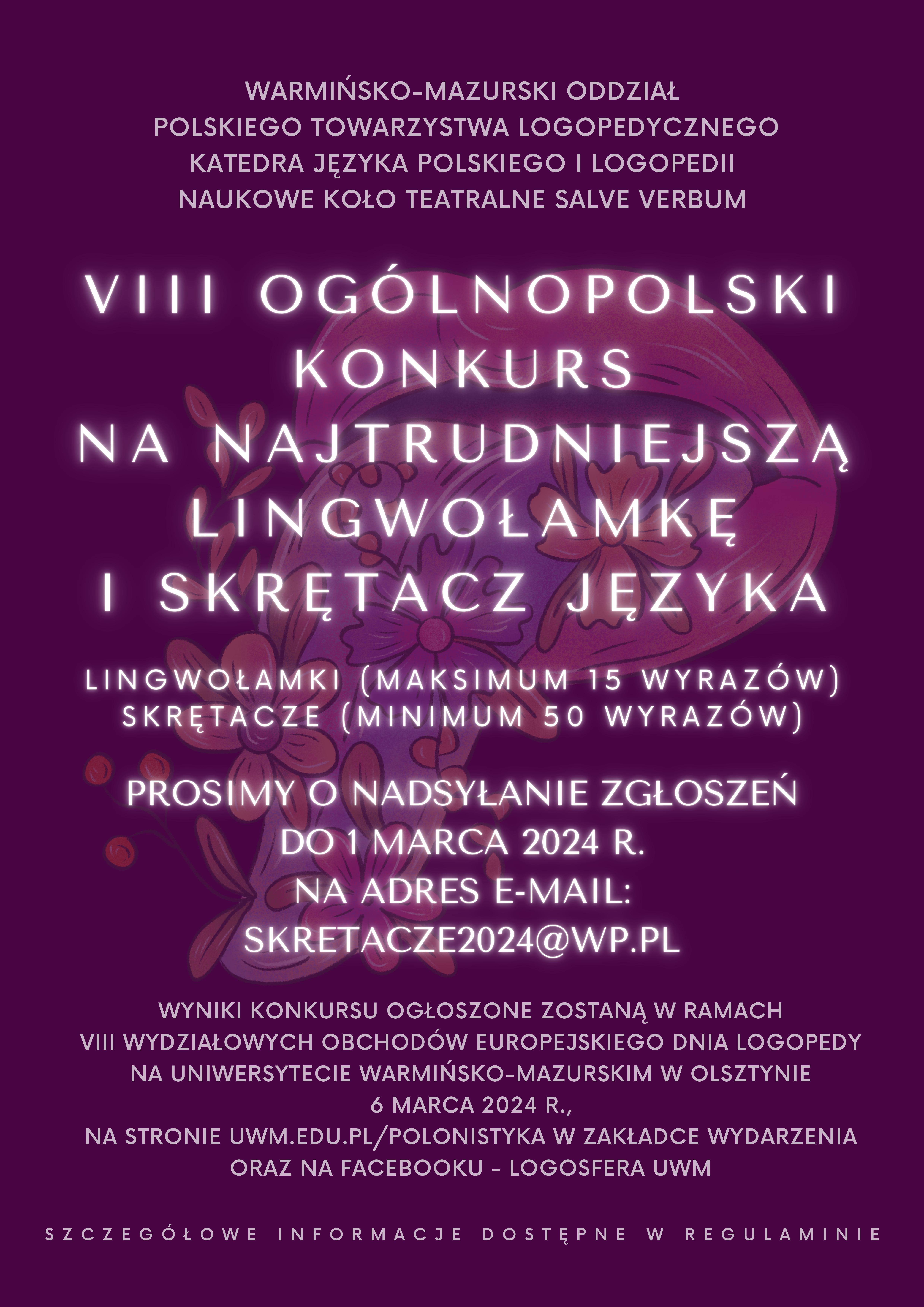 3. Wyniki konkursu zamieszczone zostaną 6 marca 2024 r. w dniu, w którym obchodzony jest Europejski Dzień Logopedy, na stronie www.uwm.edu.pl/polonistyka/ w zakładce Wydarzenia oraz na Facebooku Logosfera UWM.