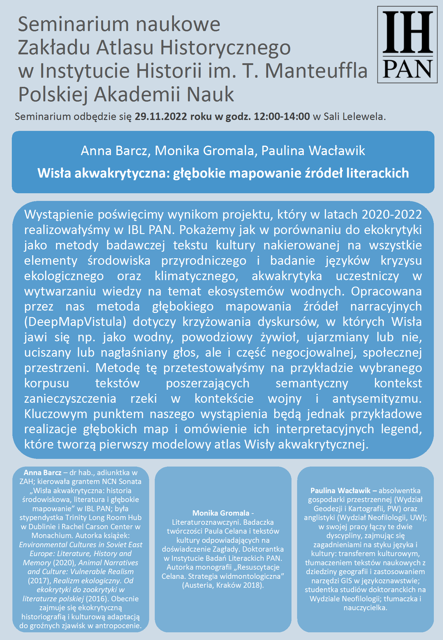 Wisła akwakrytyczna: głębokie mapowanie źródeł literackich / seminarium naukowe Zakładu Atlasu Historycznego w Instytucie Historii im. T. Manteuffla Polskiej Akademii Nauk