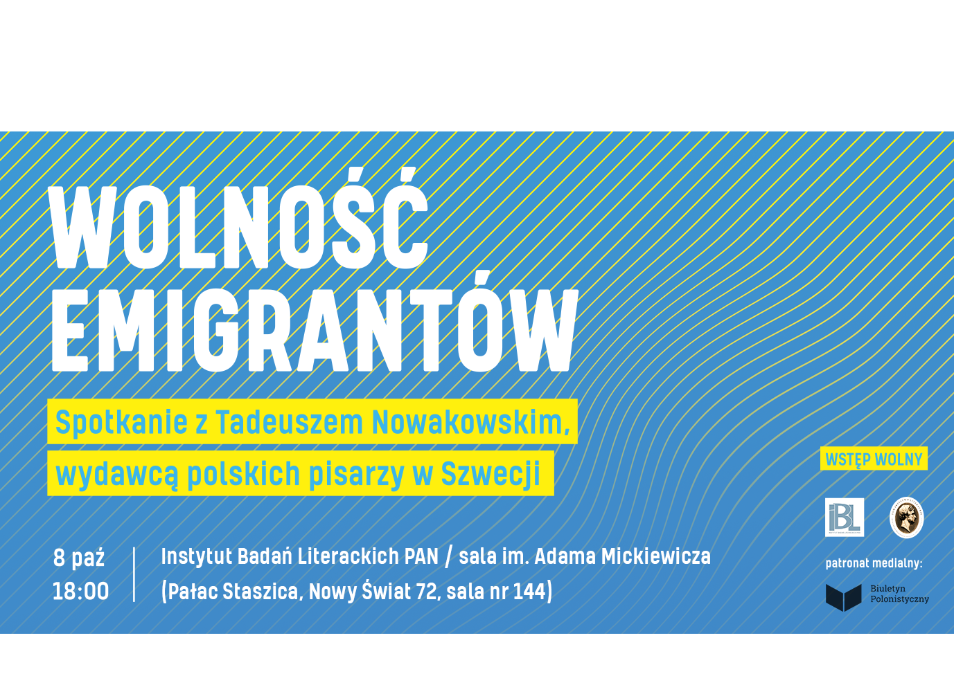 Instytut Badań Literackich PAN oraz Towarzystwo Literackie im. Adama Mickiewicza zapraszają na spotkanie z p. Tadeuszem Nowakowskim wydawcą polskich pisarzy w Szwecji.