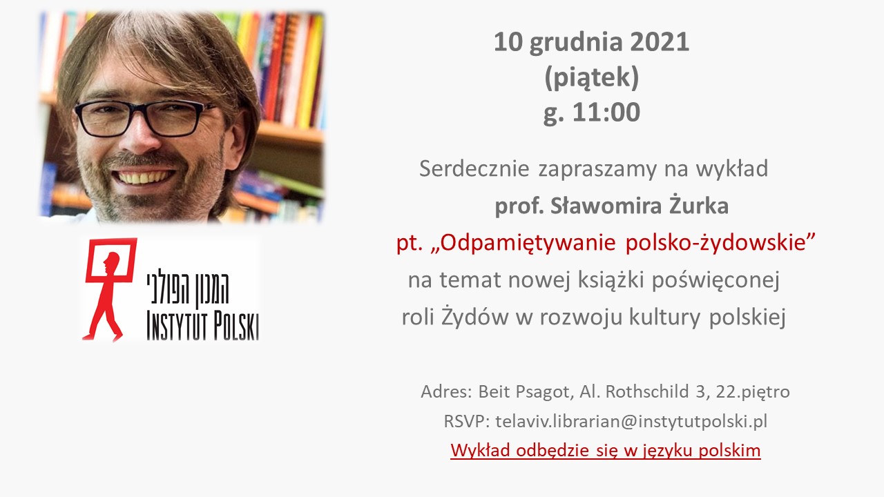 Wykład literaturoznawcy, dyrektora Międzynarodowego Ośrodka Badań nad Historią i Dziedzictwem Kulturowym Żydów Europy Środkowej i Wschodniej KUL prof. Sławomira Jacka Żurka odbędzie się 10 grudnia 2021 r. o godz. 11.00 w Instytucie Polskim w Tel Avivie.