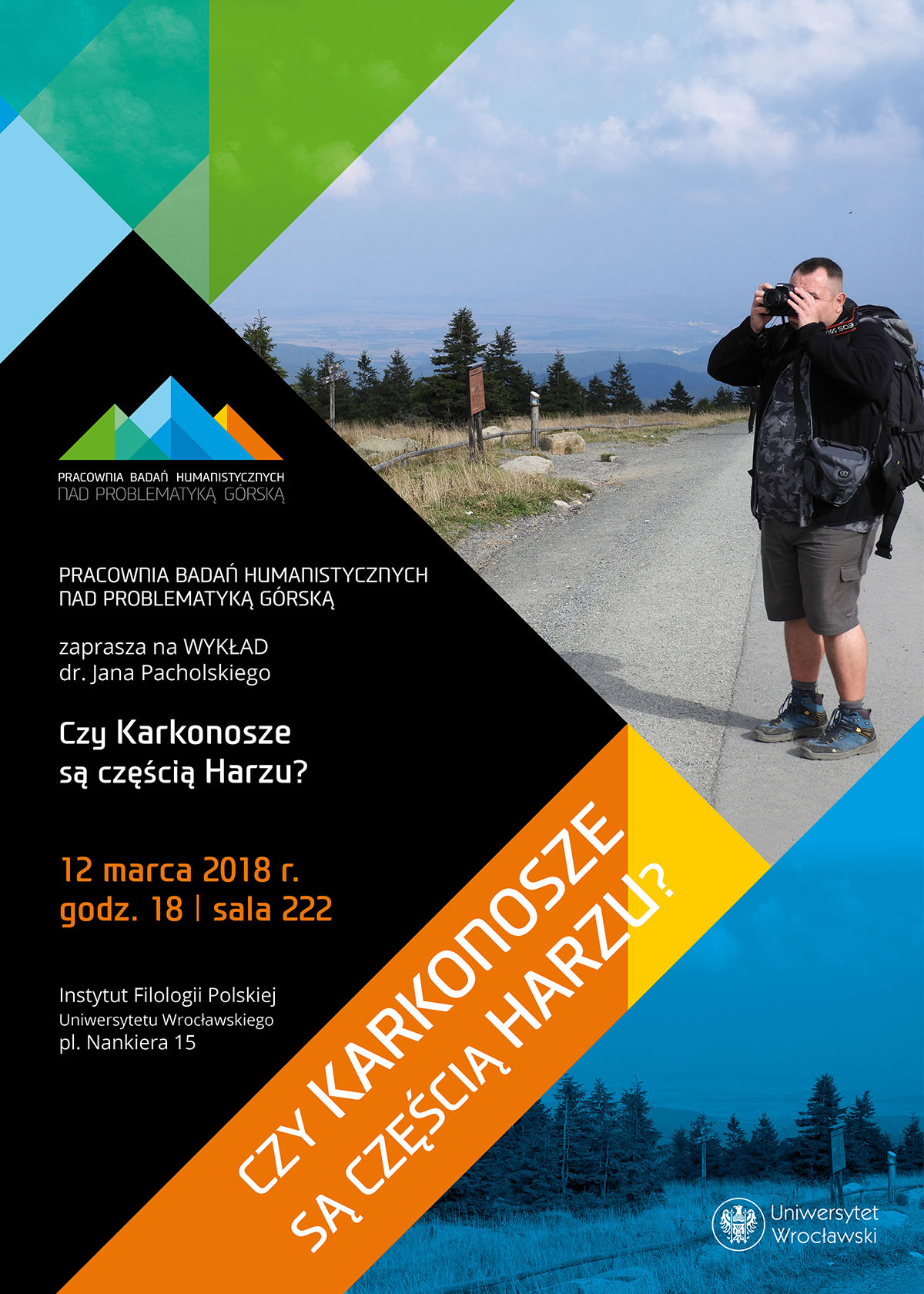 Pracownia Badań Humanistycznych nad Problematyką Górską IFP UWr zaprasza na wykład otwarty dr. Jana Pacholskiego "Czy Karkonosze są częścią Harzu?". Wykład odbędzie się 12 marca 2018 r. o godz. 18.00 w Instytucie Filologii Polskiej Uniwersytetu Wrocławskiego (Wrocław pl. Nankiera 15) w sali 222.
