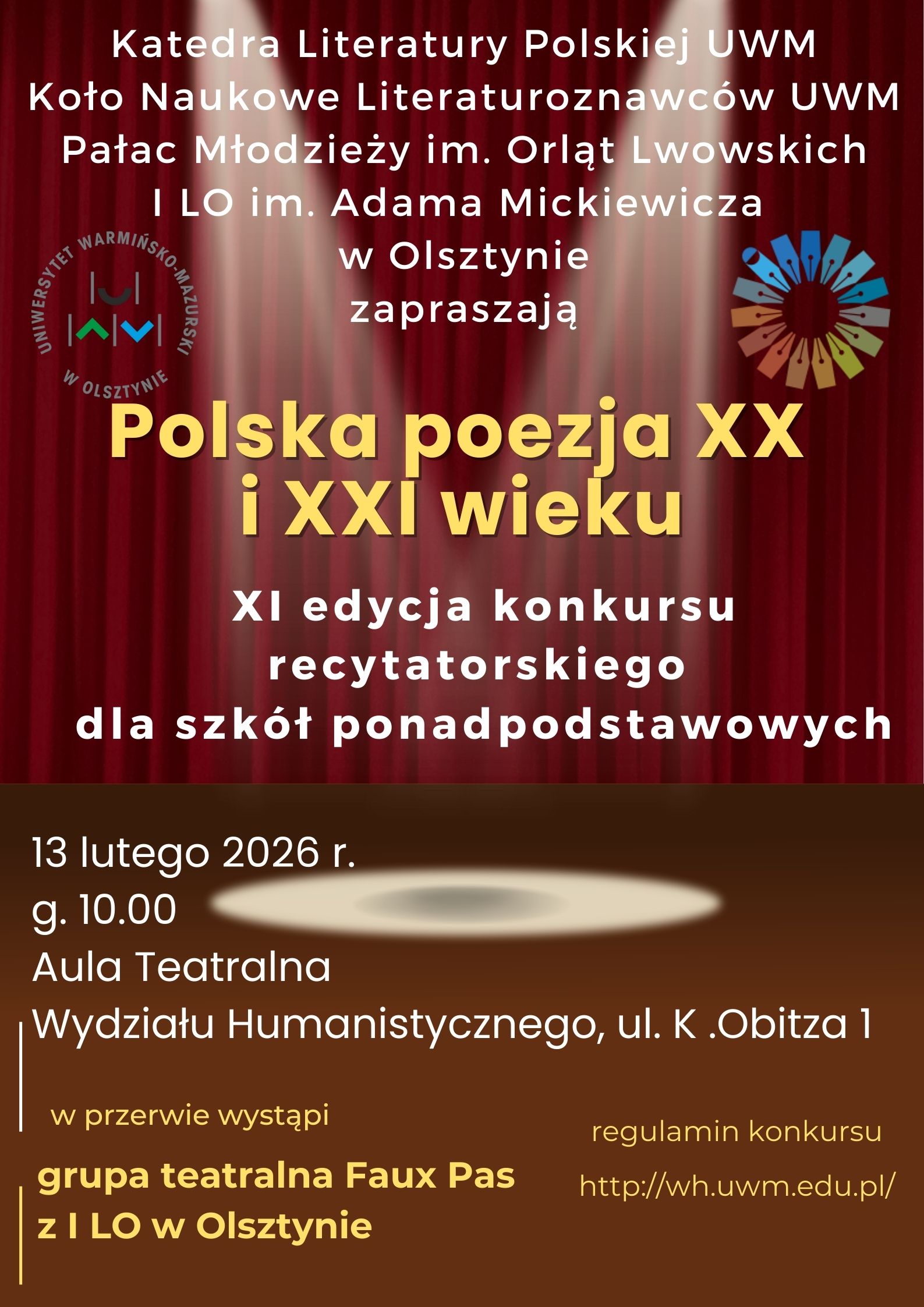 2) Konkurs odbędzie się przy ul. Kurta Obitza 1, na Wydziale Humanistycznym UWM, w Auli Teatralnej, dnia 13 lutego 2026 roku, o godz. 10:00.