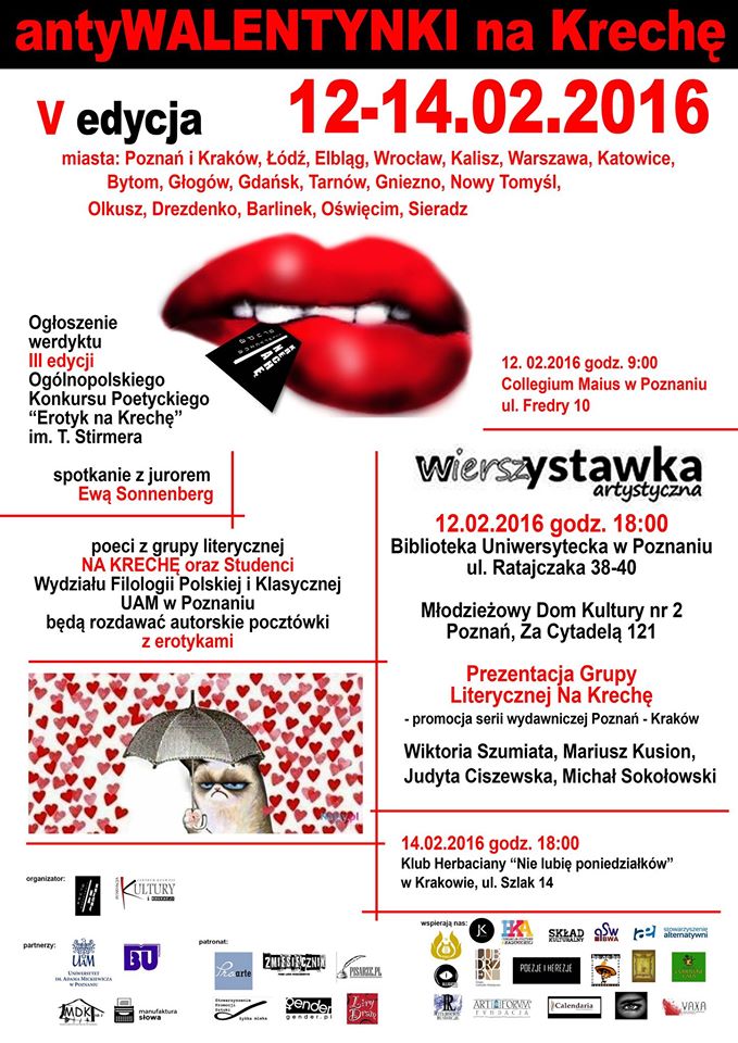 Zapraszamy do Biblioteki Uniwersyteckiej UAM w Poznaniu 12 lutego 2016 r. o godz. 18.00 na wernisaż WierszYstawki artystycznej wybranych pocztówek autorskich z pięciu edycji akcji antyWalentynkowej członków Grupy Na Krechę i gościnnie Studentów Wydziału Filologii Polskiej i Klasycznej UAM.