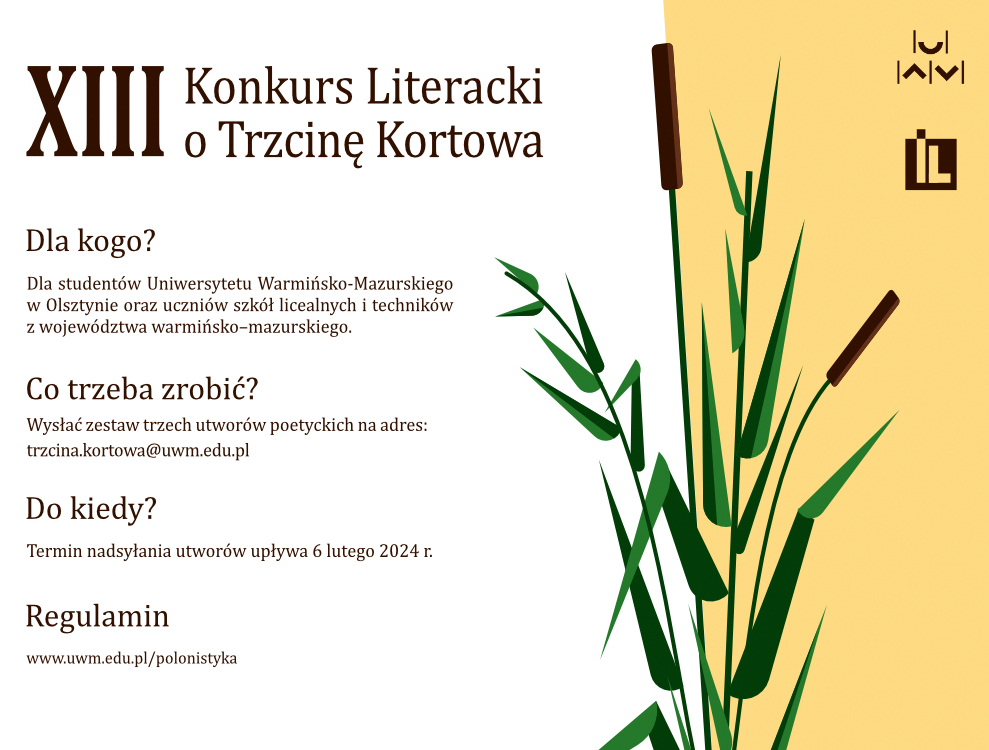 Katedra Literatury Polskiej Instytutu Literaturoznawstwa UWM w Olsztynie zaprasza do udziału w XIII edycji „Konkursu Literackiego o Trzcinę Kortowa”. Jest on skierowany zarówno do uczniów szkół ponadpodstawowych naszego województwa, jak i do studentów Uniwersytetu Warmińsko-Mazurskiego w Olsztynie.