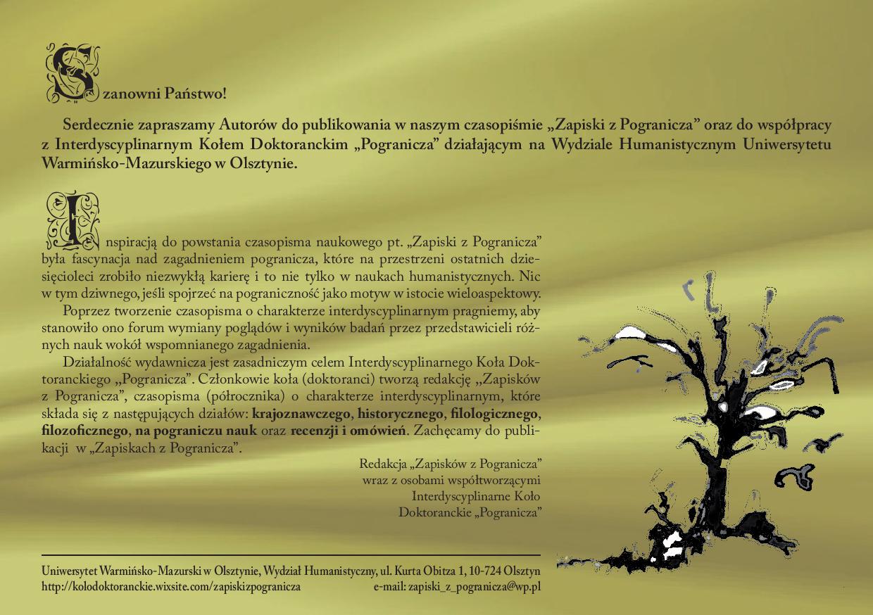 Serdecznie zapraszamy Autorów do publikowania w naszym czasopiśmie „Zapiski z Pogranicza" oraz do współpracy z Interdyscyplinarnym Kołem Doktoranckim „Pogranicza", działającym na Wydziale Humanistycznym Uniwersytetu Warmińsko -Mazurskiego w Olsztynie.