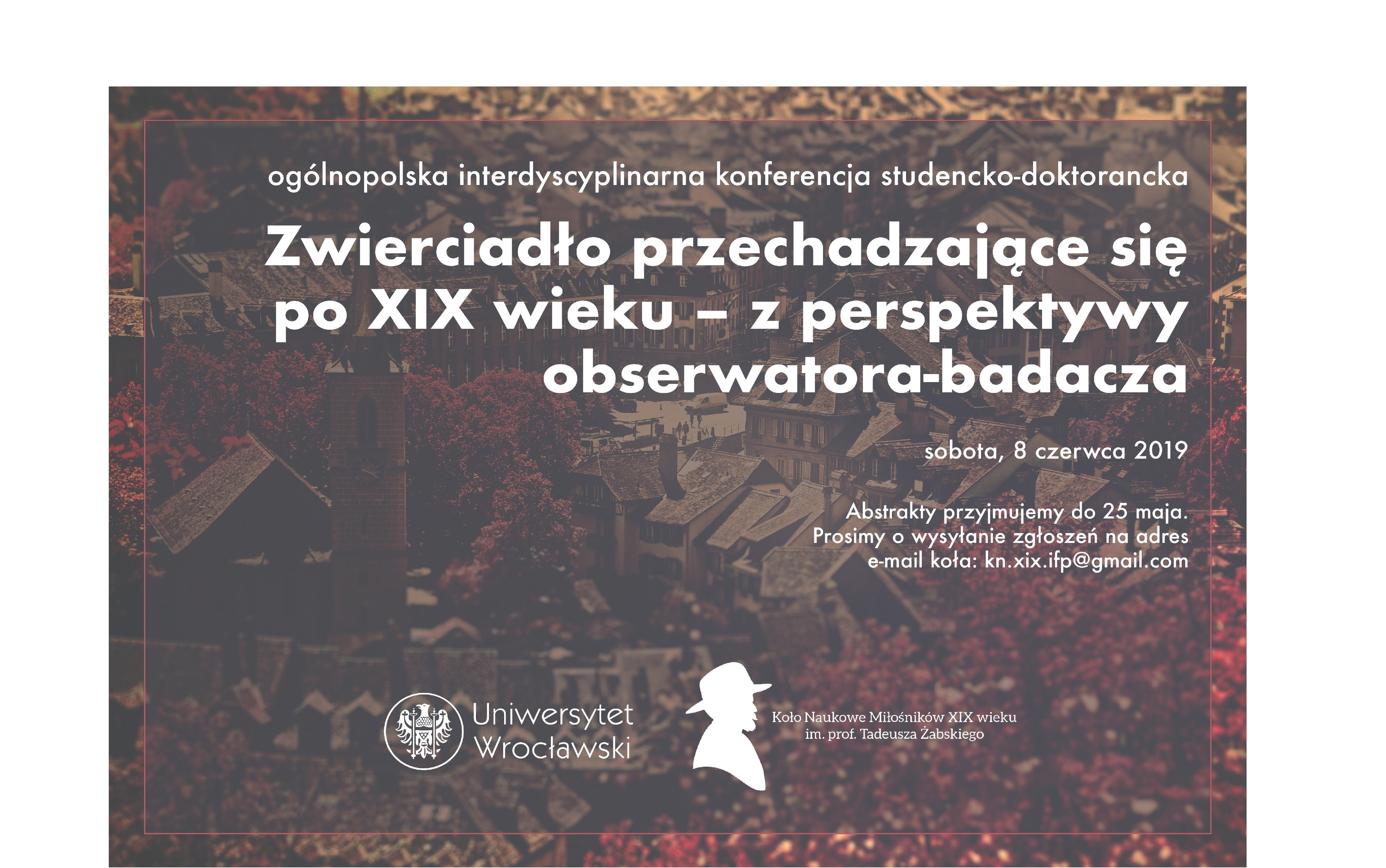 Koło Naukowe Miłośników XIX wieku im. prof. Tadeusza Żabskiego, działające przy Instytucie Filologii Polskiej Uniwersytetu Wrocławskiego, ma zaszczyt zaprosić na Ogólnopolską Konferencję studencko-doktorancką: Zwierciadło przechadzające się po XIX wieku – z perspektywy obserwatora-badacza. Pragniemy podjąć tak rozległy temat, ponieważ jesteśmy zainteresowani różnymi spojrzeniami na wiek XIX i jego dokonania. Zachęcamy do udziału studentów i doktorantów różnych kierunków.