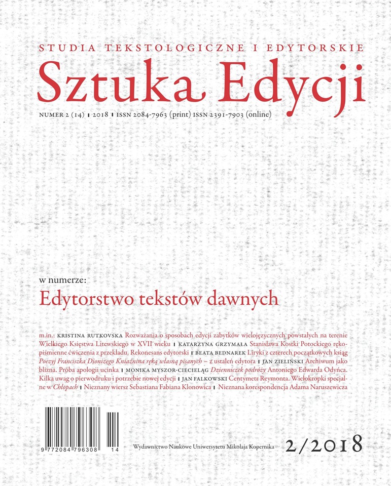W pierwszej kolejności wskazujemy na osiągnięcia edytorstwa litewskiego. Imponujące, wielojęzyczne wydanie Punktów kazań na Post Wielki językiem litewskim zapisane, a teraz na polski język przetłumaczone Konstantego Szyrwida (1579–1631), przygotowane przez zespół badaczy z Litwy, komentuje jedna z Autorek edycji. Proponujemy także namysł nad projektem wydania antologii polskiej literatury okolicznościowej – a konkretnie poezji, która ukazywała się w Wilnie w drugiej połowie XVIII wieku i tworzyła wówczas swoistą kronikę miasta i Wielkiego Księstwa Litewskiego. Następne artykuły dotykają trzech edytorskich „zaniedbań” środowiska badaczy literatury XVIII wieku: edycji dorobku literackiego Józefa Epifaniego Minasowicza – mniej znanego poety schyłku epoki saskiej i panowania Stanisława Augusta; przekładów na język polski dokonywanych przez Stanisława Kostkę Potockiego, który od lat czeka na opublikowanie swojej twórczości poetyckiej (i prozatorskiej); wreszcie sprawy kluczowej dla badań nad polską poezją drugiej połowy XVIII wieku – projektowanej edycji krytycznej liryków z tzw. Rękopisu Puławskiego Franciszka Dionizego Kniaźnina, poetyckiego testamentu jednego z najwybitniejszych poetów epoki. Ten blok rozpraw uzupełniają: omówienie projektu edycji Dzienniczka Antoniego Edwarda Odyńca, rozważania nad interpunkcją Władysława Stanisława Reymonta, uwagi o nowej edycji dzieł zebranych Zygmunta Krasińskiego oraz szkic dotyczący fenomenu kulturowo-poznawczego, jakim jest archiwum. Archiwum, w którym pracujemy, ilekroć musimy sięgnąć po rękopis, porównać wersje, zajrzeć do autografu; które systematycznie przeszukujemy, próbując odtworzyć życie literackie interesującej nas epoki; w którym szukamy potrzebnych informacji i przekazów; które stopniowo staje się tak ważną częścią naszego zawodowego (czy tylko zawodowego?) życia. W części „materiałowej” publikujemy Epos nuptiale oraz Hymen weselny Jana Karola Dachnowskiego, nieznany wiersz Sebastiana Fabiana Klonowica, korespondencję Adama Naruszewicza i Franciszka Karpińskiego. Przeglądy zamieszczone w ostatniej części numeru pozwalają zorientować się w aktualnej sytuacji edytorskiej polskiej literatury dawnej, ukazującej się w najbardziej znanych seriach wydawniczych.
