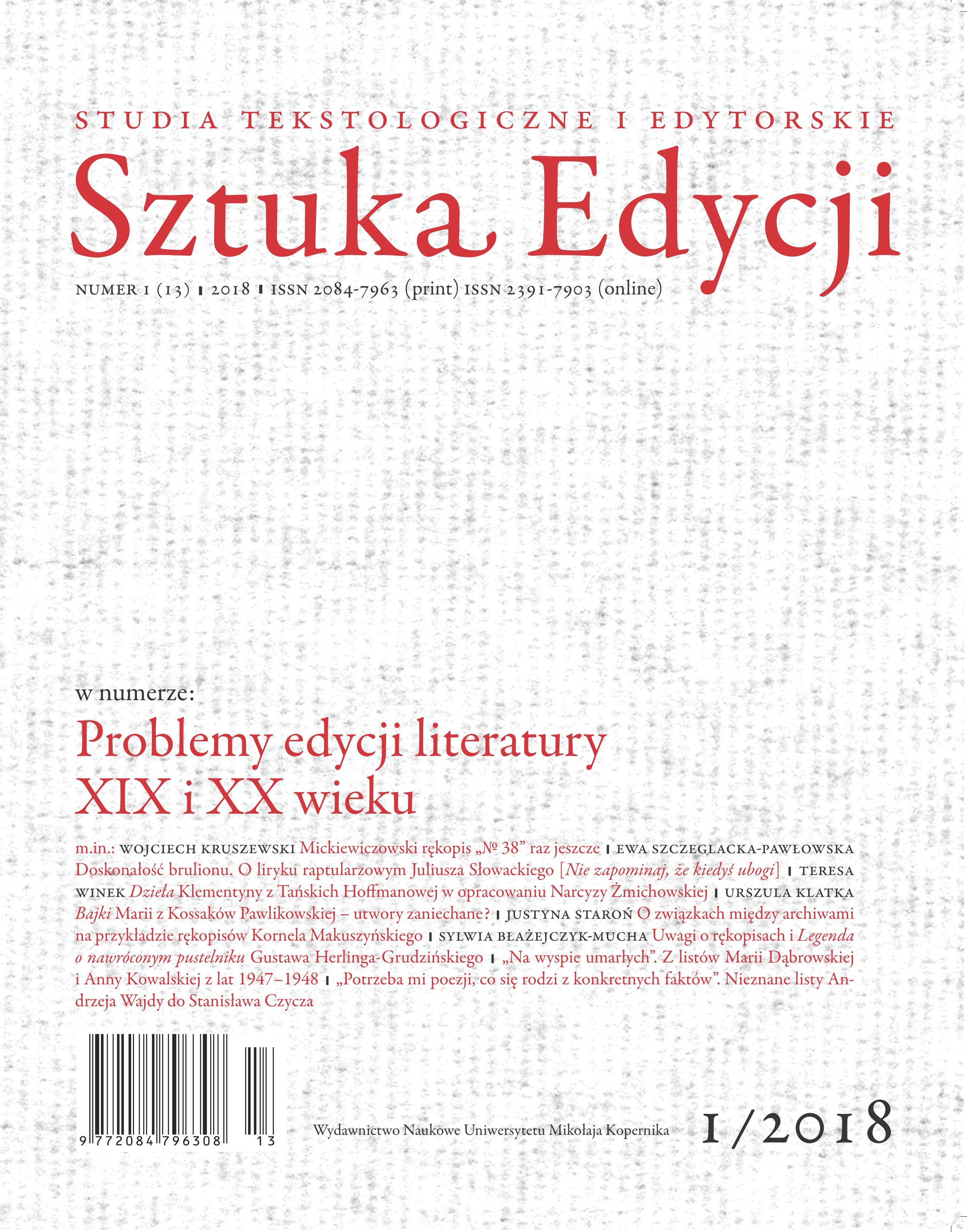 Inne teksty, które znalazły się w dziale „Artykuły i rozprawy”, wprowadzają w obszar filologicznych rozterek badaczy podejmujących się analizy rękopisów Marii Pawlikowskiej, Kornela Makuszyńskiego, Edwarda Stachury czy Gustawa Herlinga--Grudzińskiego. Naszych czytelników mogą zaciekawić także relacje związane z przygotowywaniem konkretnych edycji. Myślę tu o artykule Teresy Winek rekonstruującej wydawnicze dzieje Dzieł Klementyny z Tańskich Hoffmanowej w opracowaniu Narcyzy Żmichowskiej oraz o tekście Barbary i Macieja Szargotów starających się na powrót wprowadzić do czytelniczego obiegu zapomniane utwory. Problem, z którym się zmagali, to wspólna edycja dwu powieści opublikowanych w połowie XIX wieku w różnych miejscach i wedle innych zasad. Dział zamyka artykuł Mirosława Strzyżewskiego poświęcony Konradowi Górskiemu, toruńskiemu badaczowi, który przez wielu uczniów uznawany był za mistrza w zakresie edytorstwa i interpretacji tekstów romantycznych.