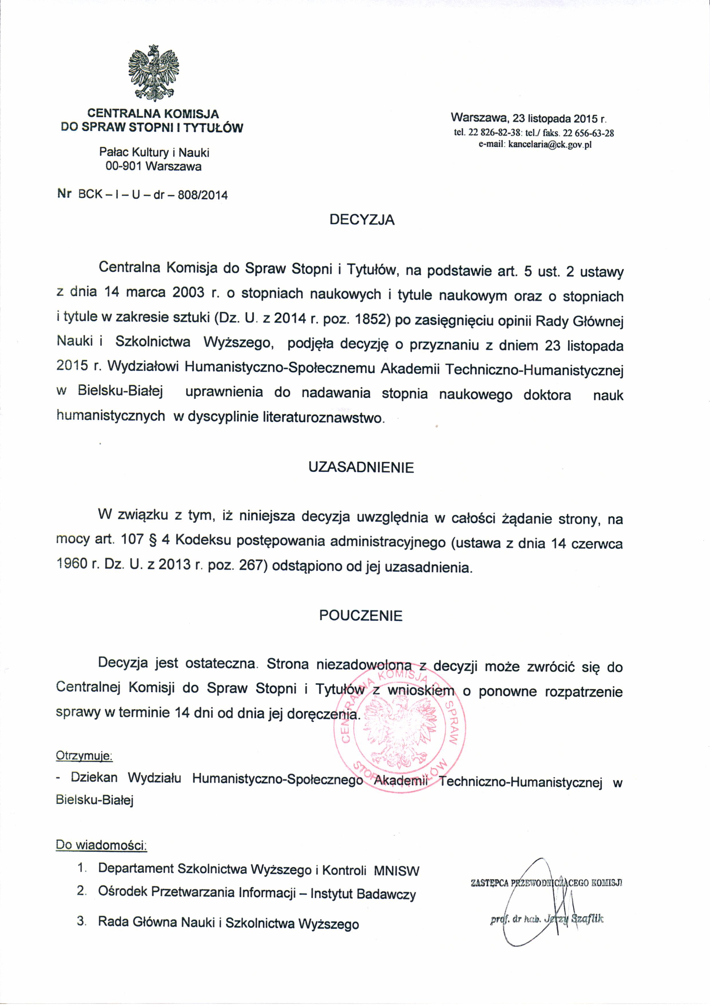 Wydział Humanistyczno-Społeczny ATH uzyskał prawa doktoryzowania w dyscyplinie literaturoznawstwo