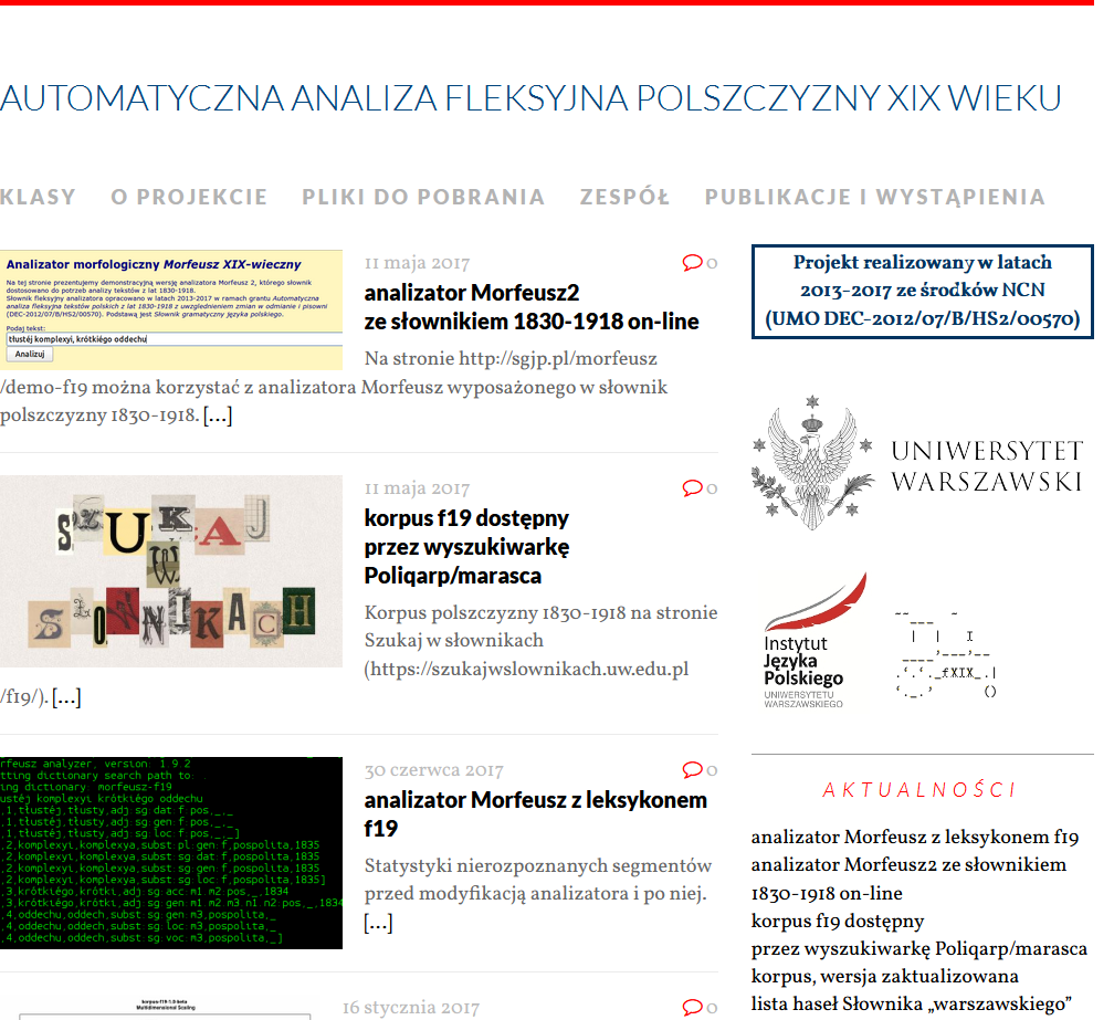 Celem projektu jest stworzenie analizatora fleksyjnego dla polszczyzny drugiej połowy doby nowopolskiej, co jest wstępnym krokiem dla komputerowej analizy tekstów dawnych. Analizator ten będzie rozpoznawać formy z zachowaniem osobliwości odmiany i pisowni lat 1830-1918. Jego struktura zostanie tak zaprojektowana, by mógł on być podstawą dalszych rozszerzeń o stany wcześniejsze (przede wszystkim o pierwszą połowę doby nowopolskiej).