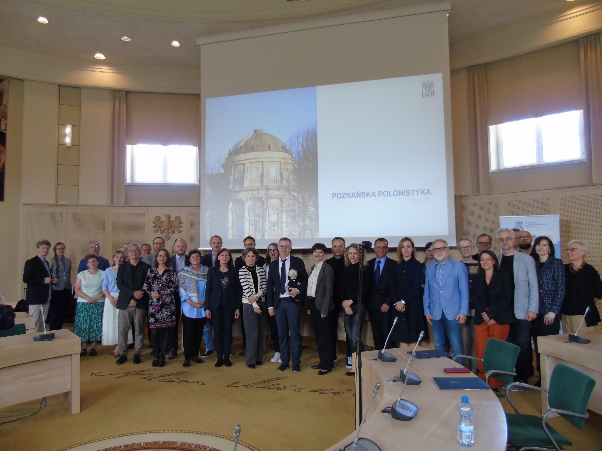 Prof. Elżbieta Winiecka przedstawiła rys historyczny poznańskiej polonistyki od 1919 roku, czyli od powstania Uniwersytetu Poznańskiego i czasów, gdy siedzibą polonistów był Zamek Cesarski, przez rok 1969, kiedy to powstał Instytut Filologii Polskiej, mieszczący się w nowoczesnym Collegium Novum, po czasy współczesne i przeprowadzkę do Collegium Maius przy ul. A. Fredry, którą nadzorował ówczesny dziekan Wydziału, profesor Józef Tomasz Pokrzywniak. Prof. Pokrzywniak zainicjował również powstanie w 2007 roku nowoczesnej biblioteki wydziałowej. W 2018 roku upamiętniono jego zasługi nadając jej imię J.T. Pokrzywniaka. Prof. Winiecka zaprosiła również do lektury wydanej kilka lat temu, niezwykłej rocznicowej trzytomowej publikacji pt. Stulecie poznańskiej polonistyki. Fakt, że na pierwszym planie zaprezentowano w niej sylwetki profesorów oraz ich dokonania, dobrze określa dzisiejszą tożsamość poznańskich polonistów, którzy pamiętają o swoich mistrzach.