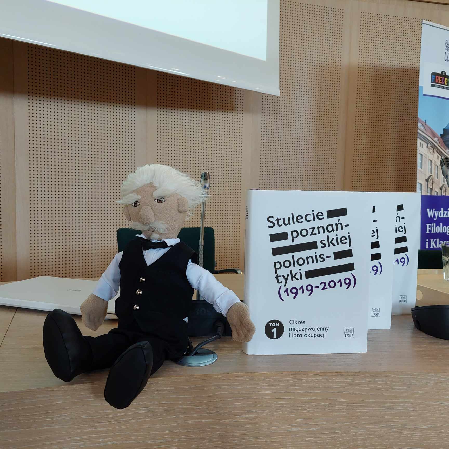 Pan Aleksander - maskotka IFPiK UAM oraz trzytomowe "Stulecie poznańskiej polonistyki".