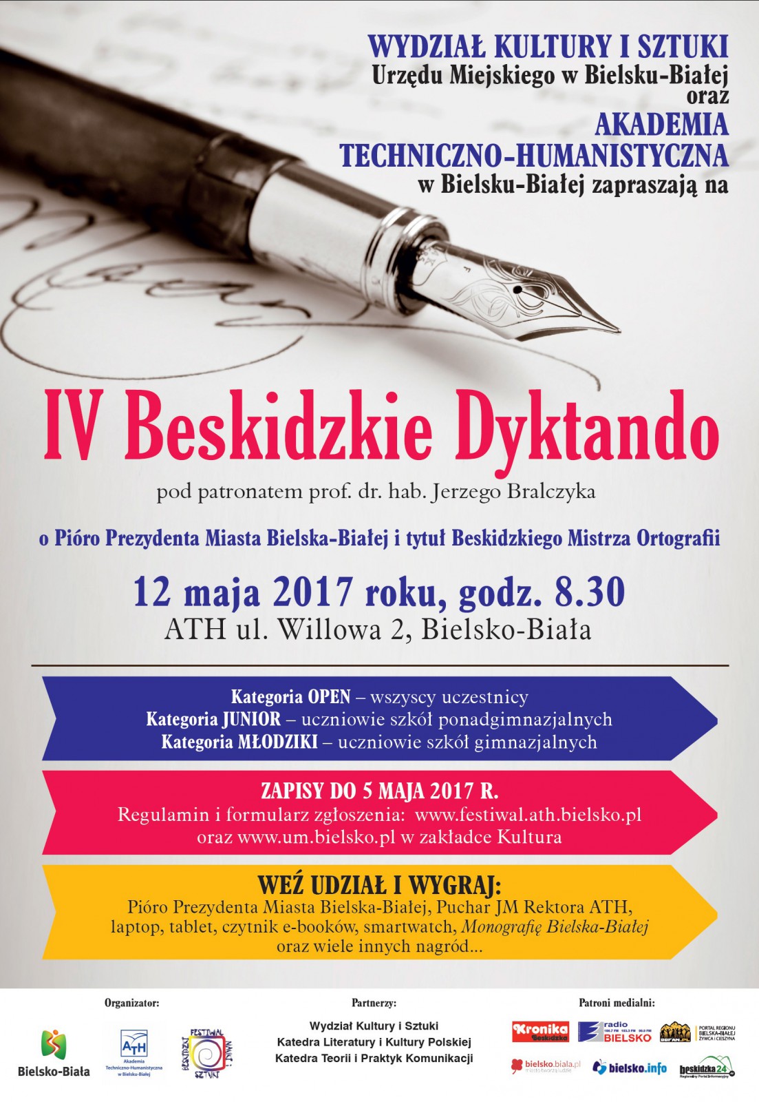 Serdecznie zapraszamy do wzięcia udziału w czwartej już edycji Beskidzkiego Dyktanda organizowanego pod honorowym patronatem prof. dr. hab. Jerzego Bralczyka w ramach XVIII Beskidzkiego Festiwalu Nauki i Sztuki.