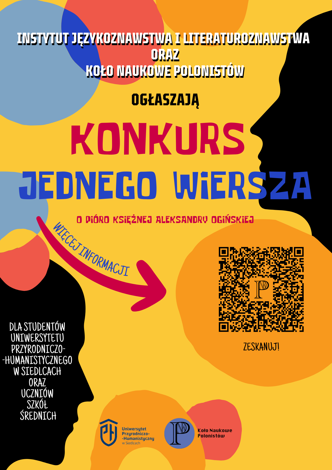 Instytut Językoznawstwa i Literaturoznawstwa oraz Koło Naukowe Polonistów Uniwersytetu Przyrodniczo-Humanistycznego w Siedlcach ogłaszają Konkurs Jednego Wiersza o Pióro Księżnej Aleksandry Ogińskiej dla studentów UPH oraz uczniów szkół średnich średnich w wieku 15-20 lat z powiatów: siedleckiego, łosickiego, sokołowskiego, węgrowskiego, mińskiego, garwolińskiego, bialskiego i łukowskiego oraz miast Siedlce i Biała Podlaska.