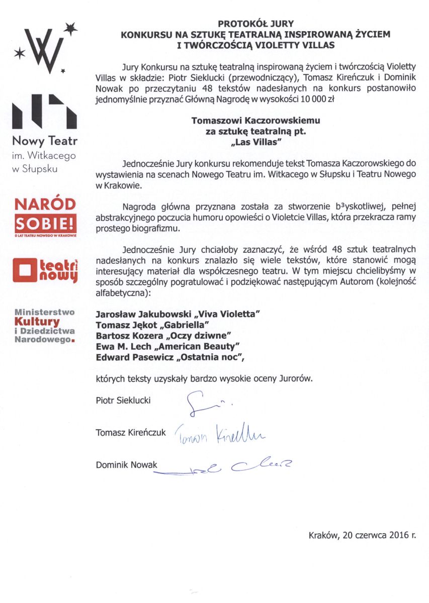 Jury Konkursu na sztukę teatralną inspirowaną życiem i twórczością Violetty Villas w składzie: Piotr Sieklucki (przewodniczący), Tomasz Kireńczuk i Dominik Nowak po przeczytaniu 48 tekstów nadesłanych na konkurs postanowiło jednomyślnie przyznać Główną Nagrodę w wysokości 10 000 zł Tomaszowi Kaczorowskiemu, za sztukę teatralną pt. „Las Villas”.