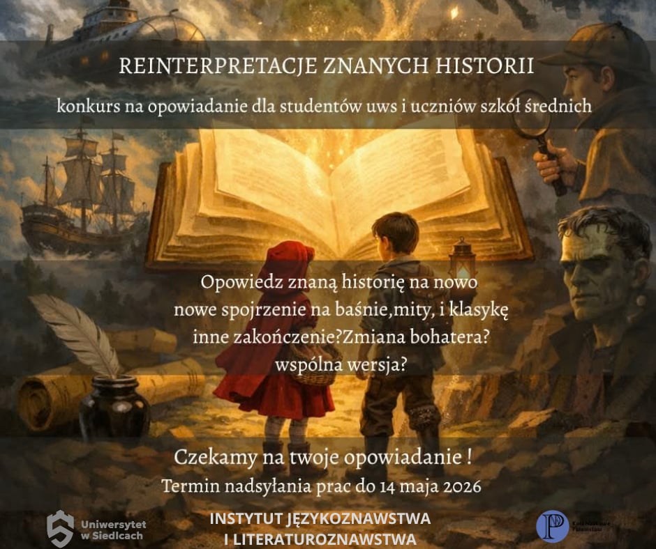 Instytut Językoznawstwa i Literaturoznawstwa oraz Koło Naukowe Polonistów ogłaszają konkurs na opowiadanie – „Reinterpretacje znanych historii” – dla wszystkich studentów Uniwersytetu w Siedlcach i uczniów szkół średnich w wieku 15-20 lat z powiatów: siedleckiego, łosickiego, sokołowskiego, węgrowskiego, mińskiego, garwolińskiego, bialskiego i łukowskiego oraz miast Siedlce i Biała Podlaska.