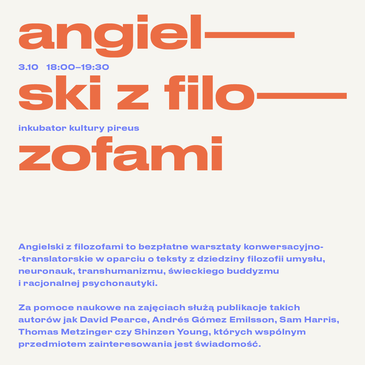 Poznański Inkubator Kultury Pireus serdecznie zaprasza na cykl warsztatów konwersacyjno-translatorskich z języka angielskiego w oparciu o teksty z dziedziny filozofii umysłu, neuronauk, transhumanizmu, świeckiego buddyzmu i racjonalnej psychonautyki. Za pomoce naukowe na zajęciach służą publikacje takich autorów jak David Pearce, Andrés Gómez Emilsson, Sam Harris, Thomas Metzinger czy Shinzen Young, których wspólnym przedmiotem zainteresowania jest świadomość.
