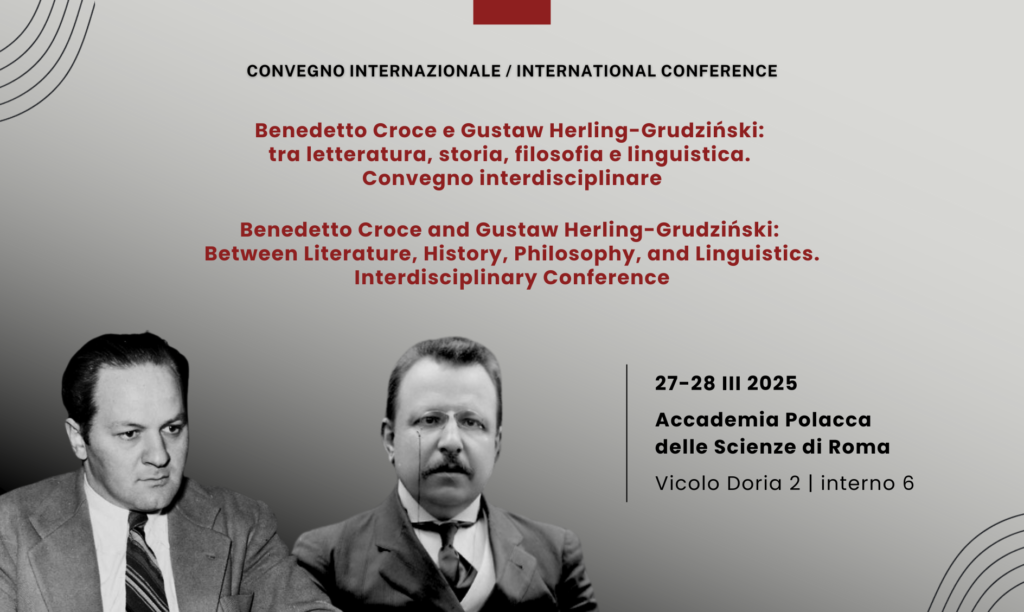 W dniach 27-28 marca 2025 roku w siedzibie Stacji Naukowej Polskiej Akademii Nauk w Rzymie odbędzie się międzynarodowa konferencja naukowa Benedetto Croce e Gustaw Herling-Grudziński: tra letteratura, storia, filosofia e linguistica. Convegno interdisciplinare / Benedetto Croce and Gustaw Herling-Grudziński: Between Literature, History, Philosophy, and Linguistics. Interdisciplinary Conference. Wydarzenie podzielone będzie na dziewięć sesji tematycznych, podczas których trzydzieścioro prelegentów z Polski i Włoch wygłosi referaty w językach włoskim oraz angielskim